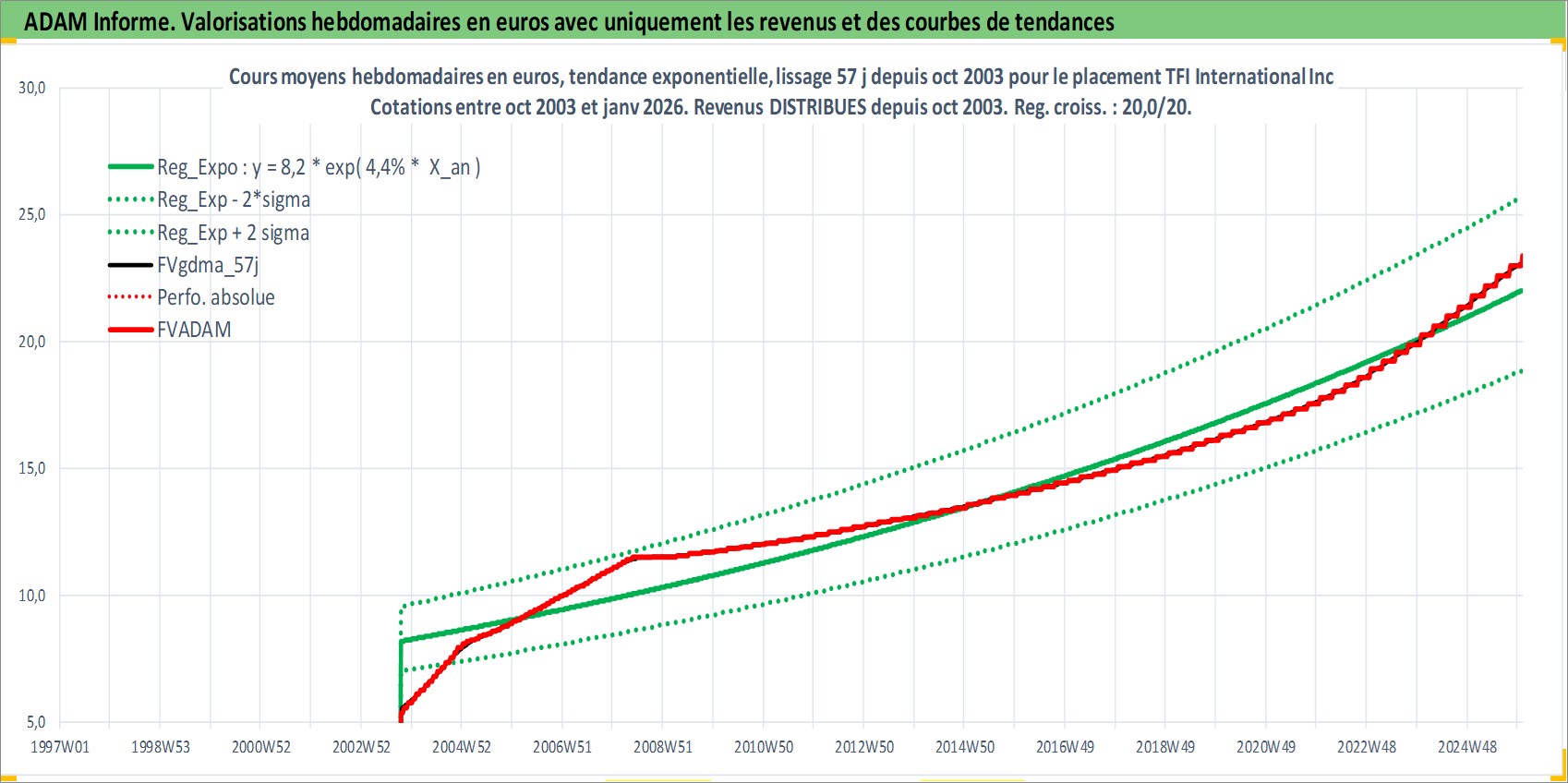 Site dédié aux investisseursPage dédiée sur site financeAnalyse des valorisations hebdomadaires de l'action TFI International Inc. Cet actif est cote en CAD. Les valorisations sont en contrevaleur EURO et couvrent les semaines 2003W41 a 2026W01. Les revenus de cet actif financier sont pris en compte depuis la semaine 2003W44. La note ESG de cet actif n'est pas connue.