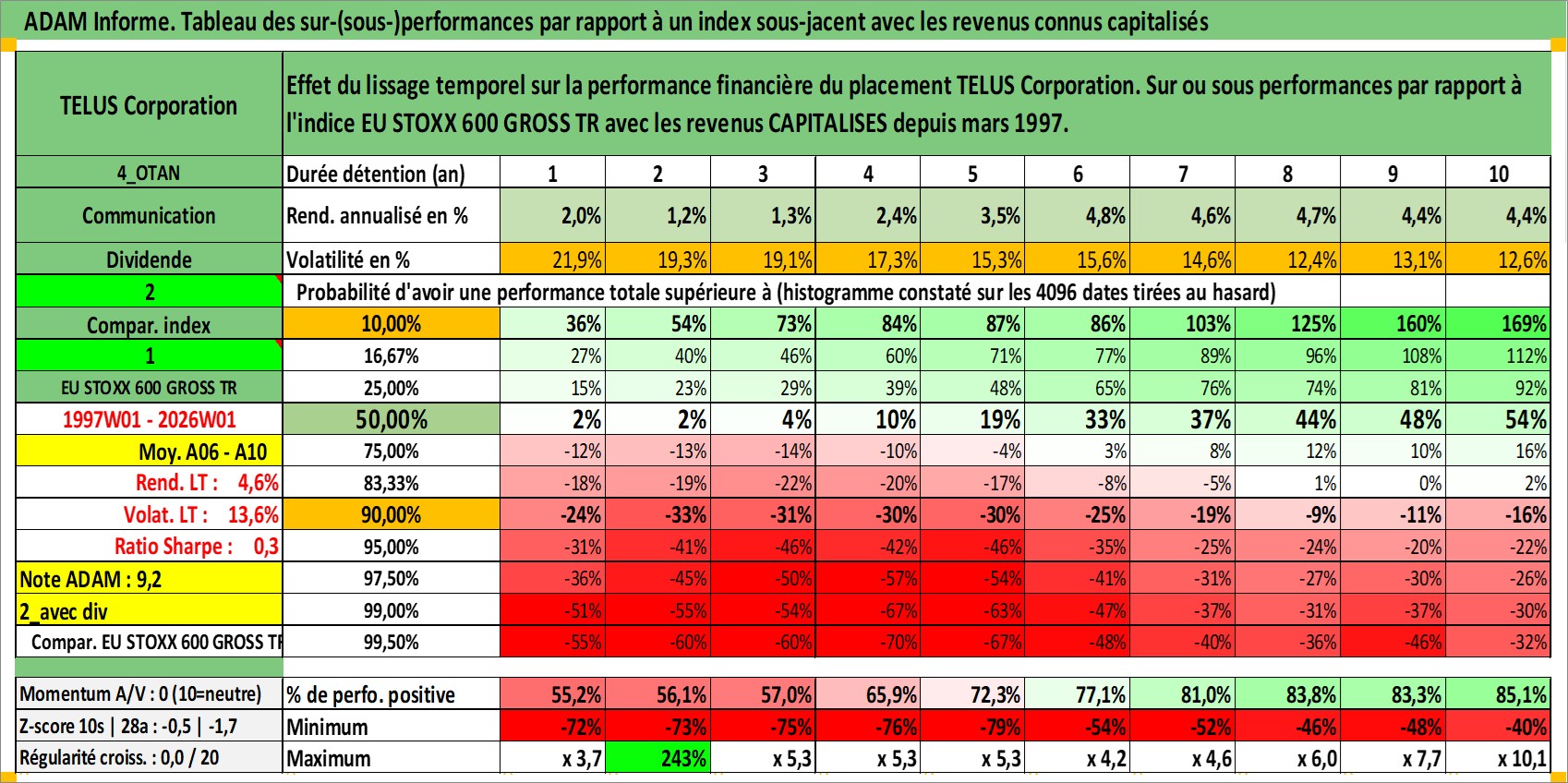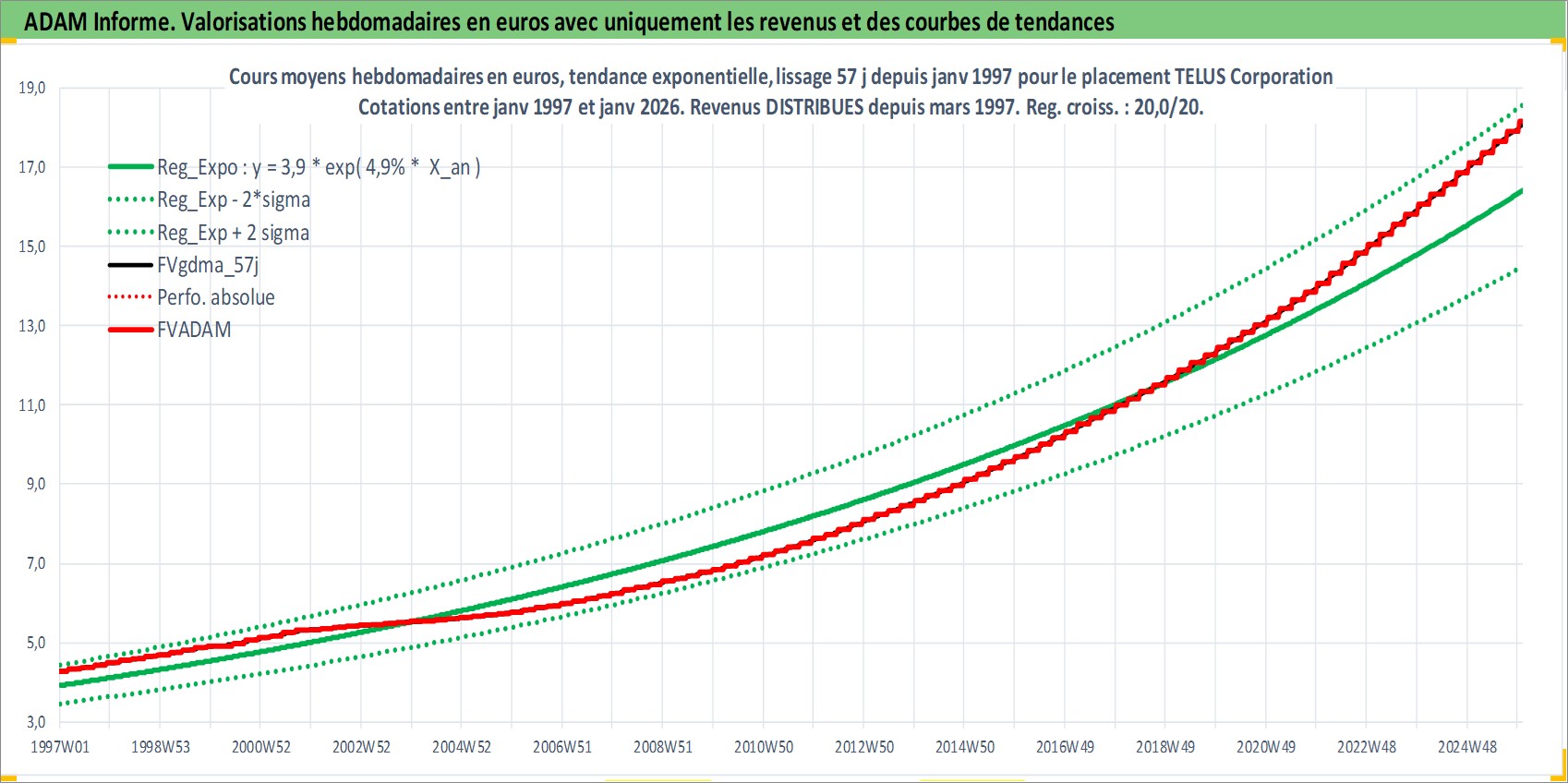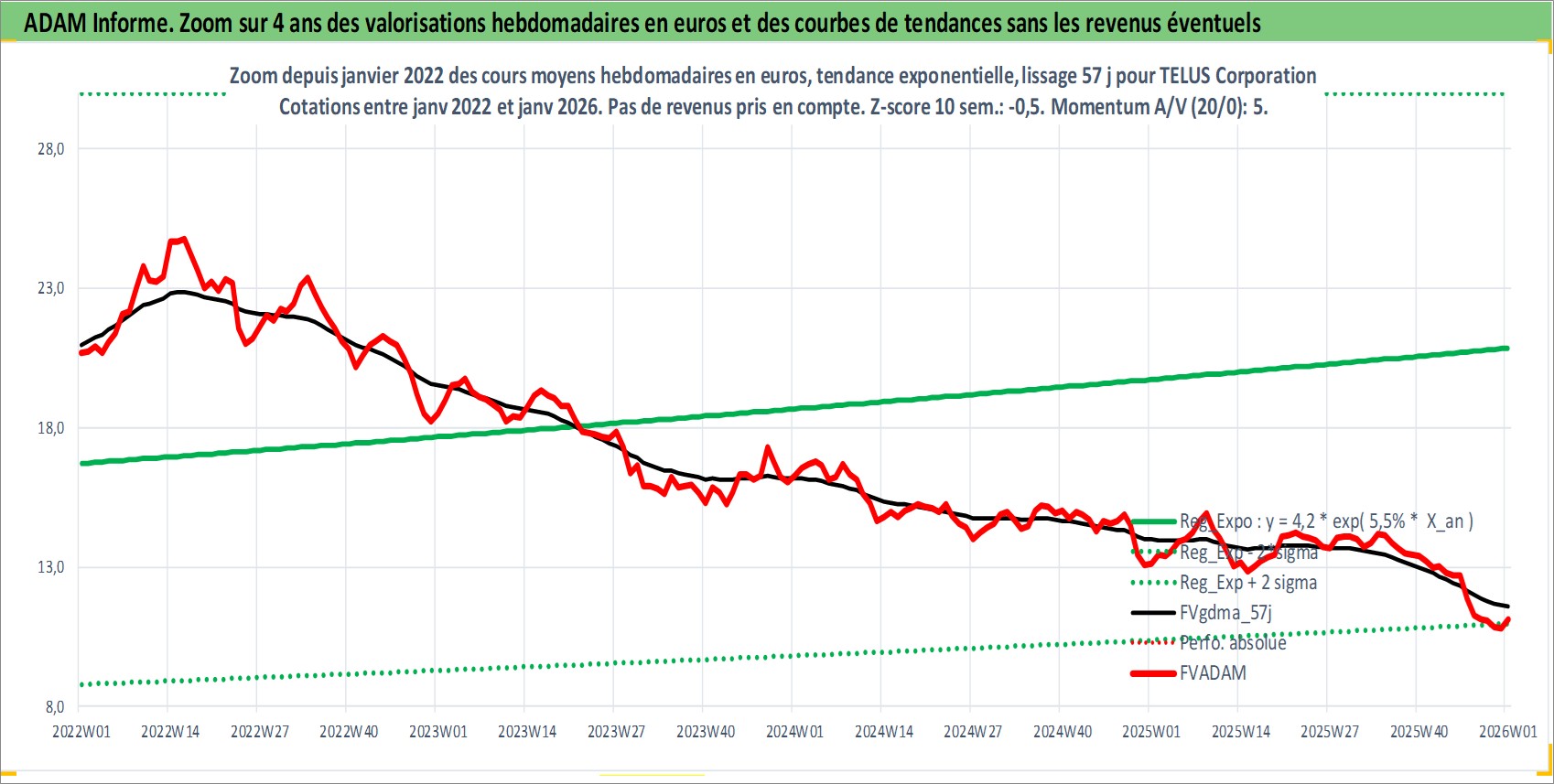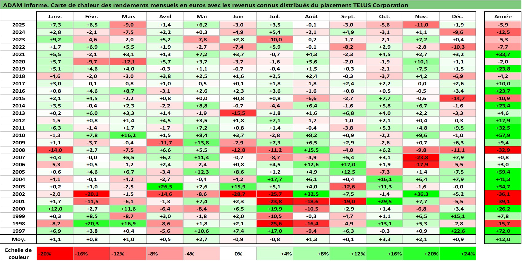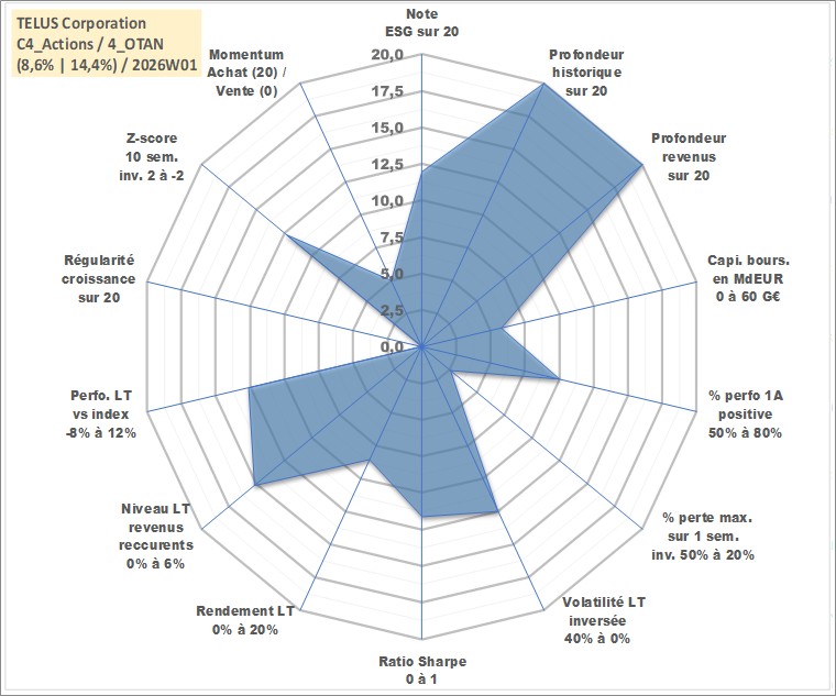 Site dédié aux investisseursPage dédiée sur site financeAnalyse des valorisations hebdomadaires de l'action TELUS Corporation. Cet actif est cote en CAD. Les valorisations sont en contrevaleur EURO et couvrent les semaines 1997W01 a 2026W01. Les revenus de cet actif financier sont pris en compte depuis la semaine 1997W10. La note globale ESG de cet actif est estimee a 12.0 (apres rebasage entre 0 et 20).
