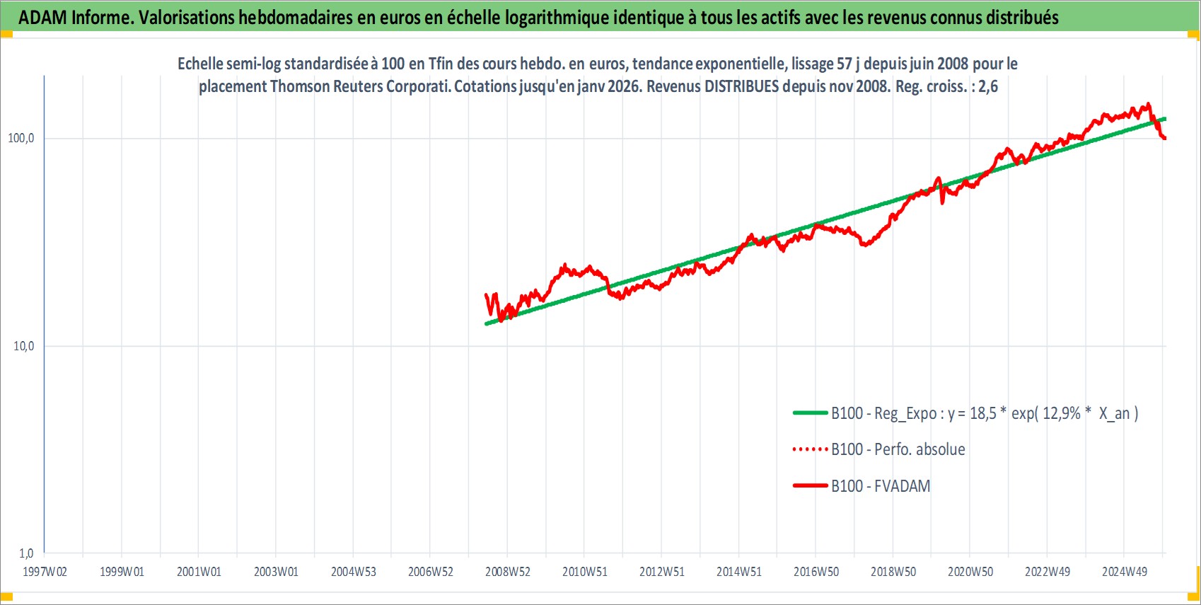 Site dédié aux investisseursPage dédiée sur site financeAnalyse des valorisations hebdomadaires de l'action Thomson Reuters Corporation. Cet actif est cote en CAD. Les valorisations sont en contrevaleur EURO et couvrent les semaines 2008W23 a 2026W01. Les revenus de cet actif financier sont pris en compte depuis la semaine 2008W47. La note globale ESG de cet actif est estimee a 18.0 (apres rebasage entre 0 et 20).