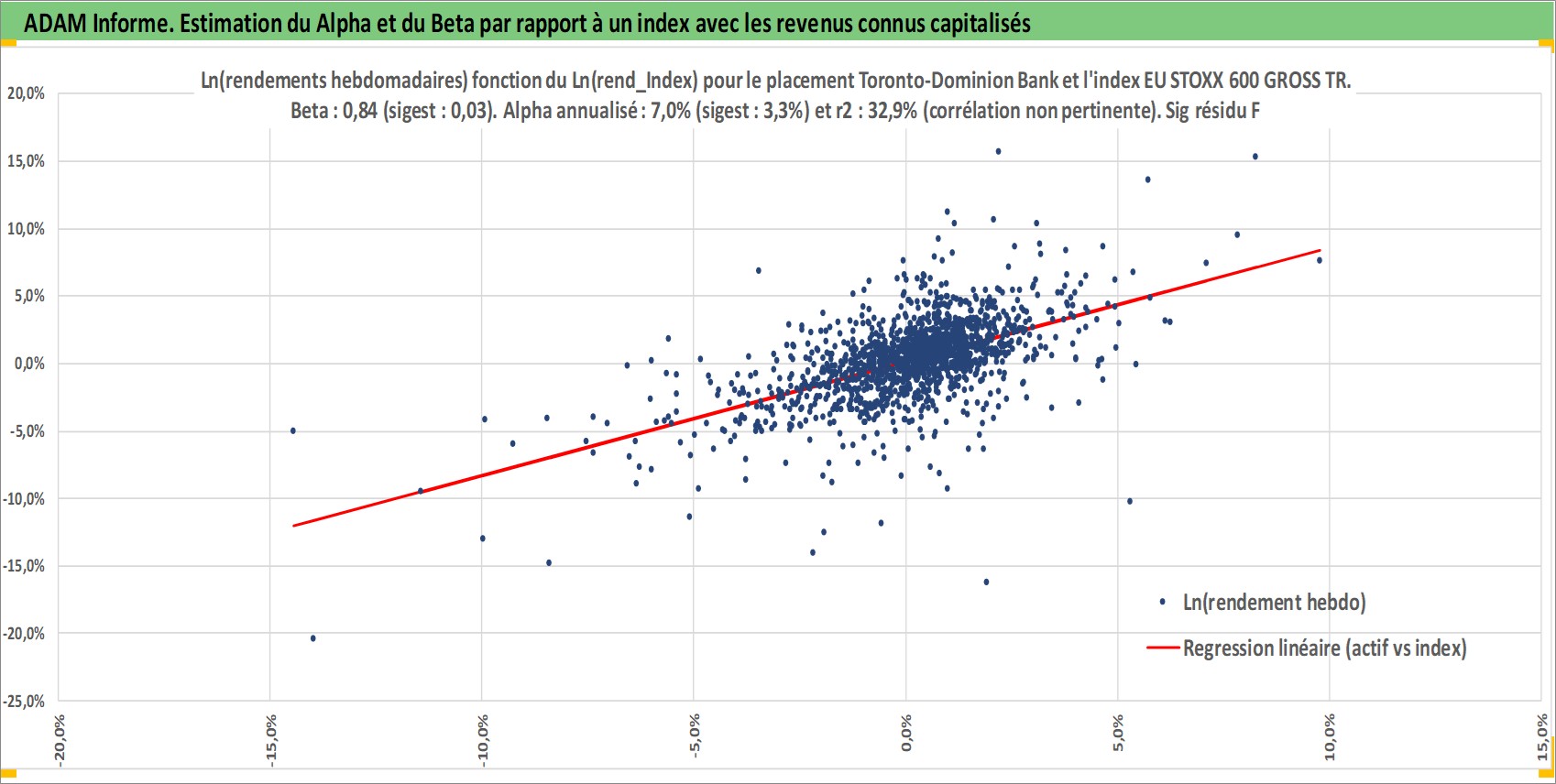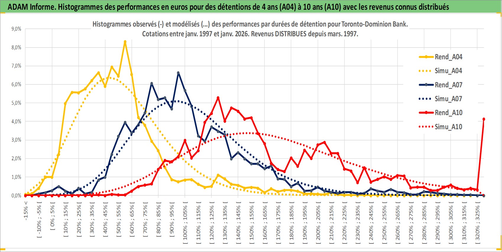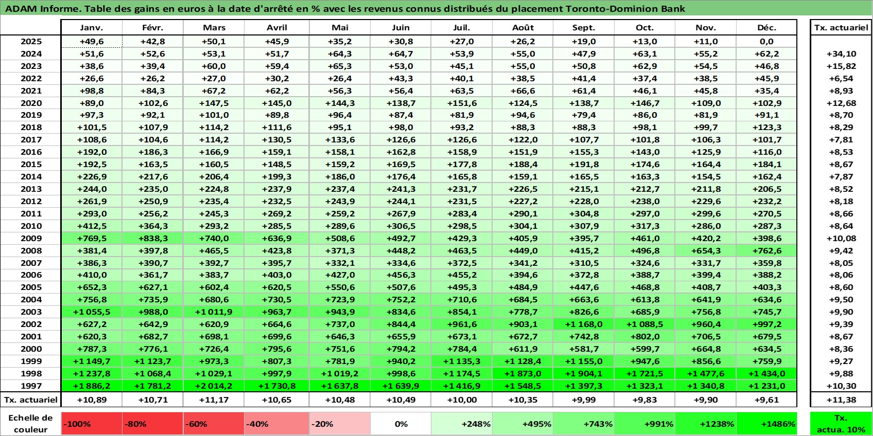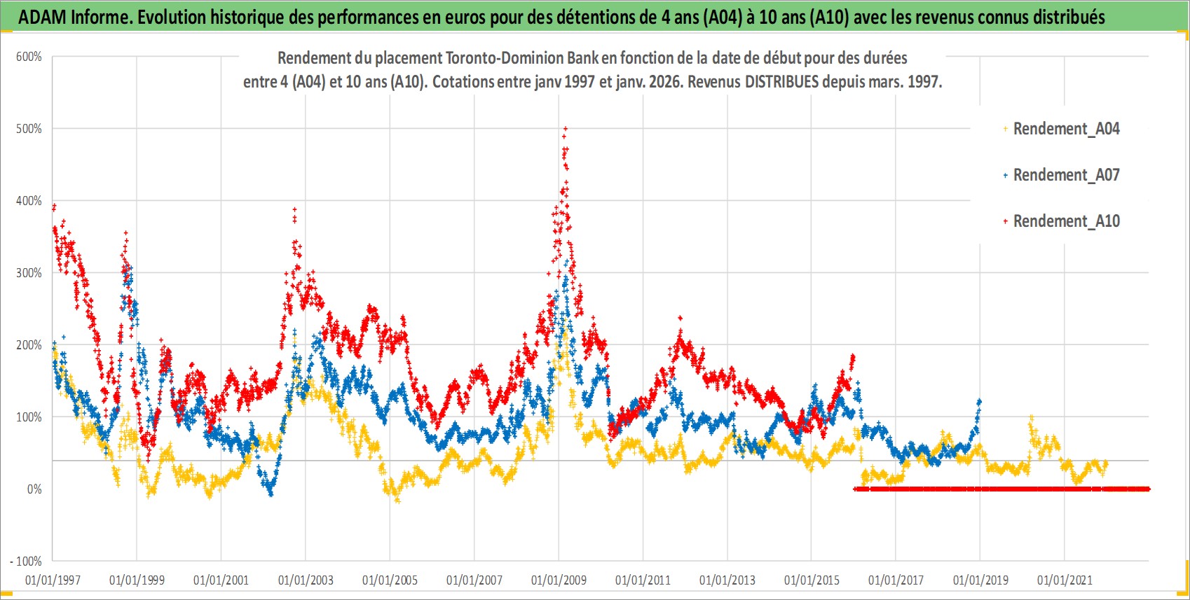 Site dédié aux investisseursPage dédiée sur site financeAnalyse des valorisations hebdomadaires de l'action Toronto-Dominion Bank. Cet actif est cote en CAD. Les valorisations sont en contrevaleur EURO et couvrent les semaines 1997W01 a 2026W01. Les revenus de cet actif financier sont pris en compte depuis la semaine 1997W12. La note globale ESG de cet actif est estimee a 10.0 (apres rebasage entre 0 et 20).