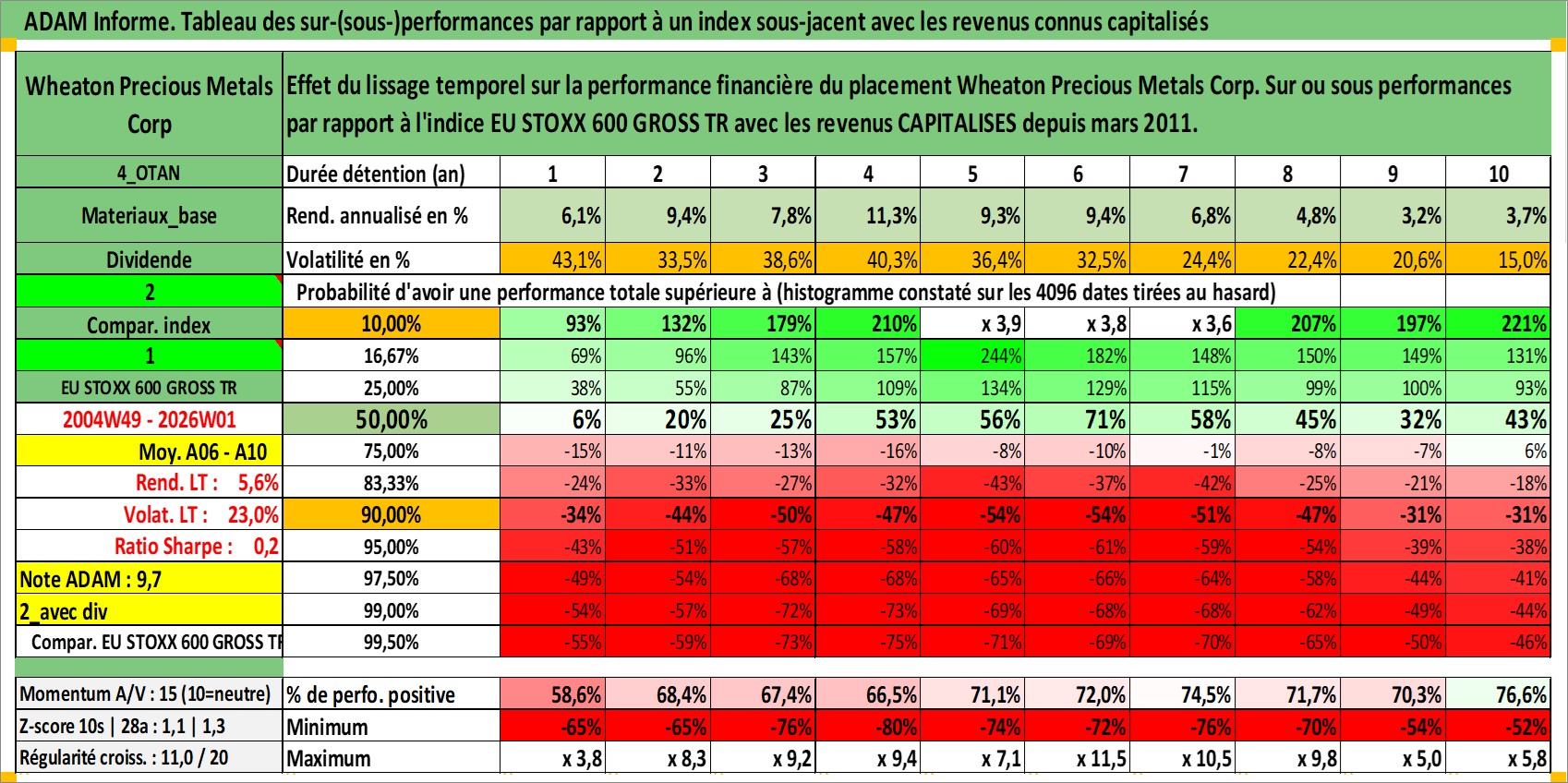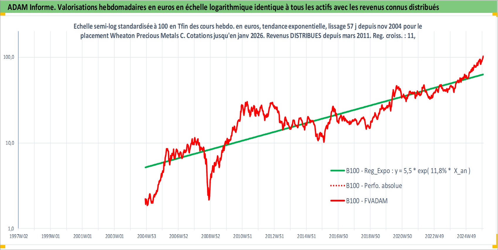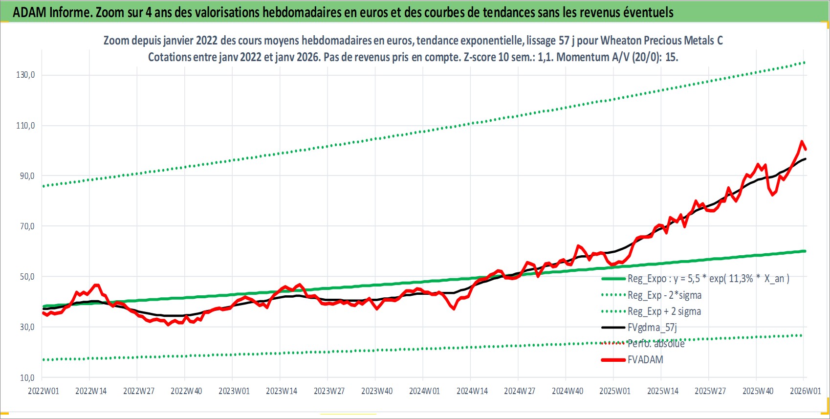 Site dédié aux investisseursPage dédiée sur site financeAnalyse des valorisations hebdomadaires de l'action Wheaton Precious Metals Corp. Cet actif est cote en CAD. Les valorisations sont en contrevaleur EURO et couvrent les semaines 2004W49 a 2026W01. Les revenus de cet actif financier sont pris en compte depuis la semaine 2011W11. La note globale ESG de cet actif est estimee a 19.0 (apres rebasage entre 0 et 20).
