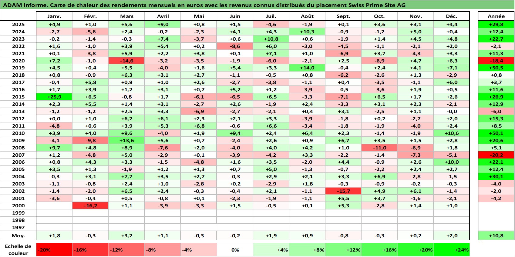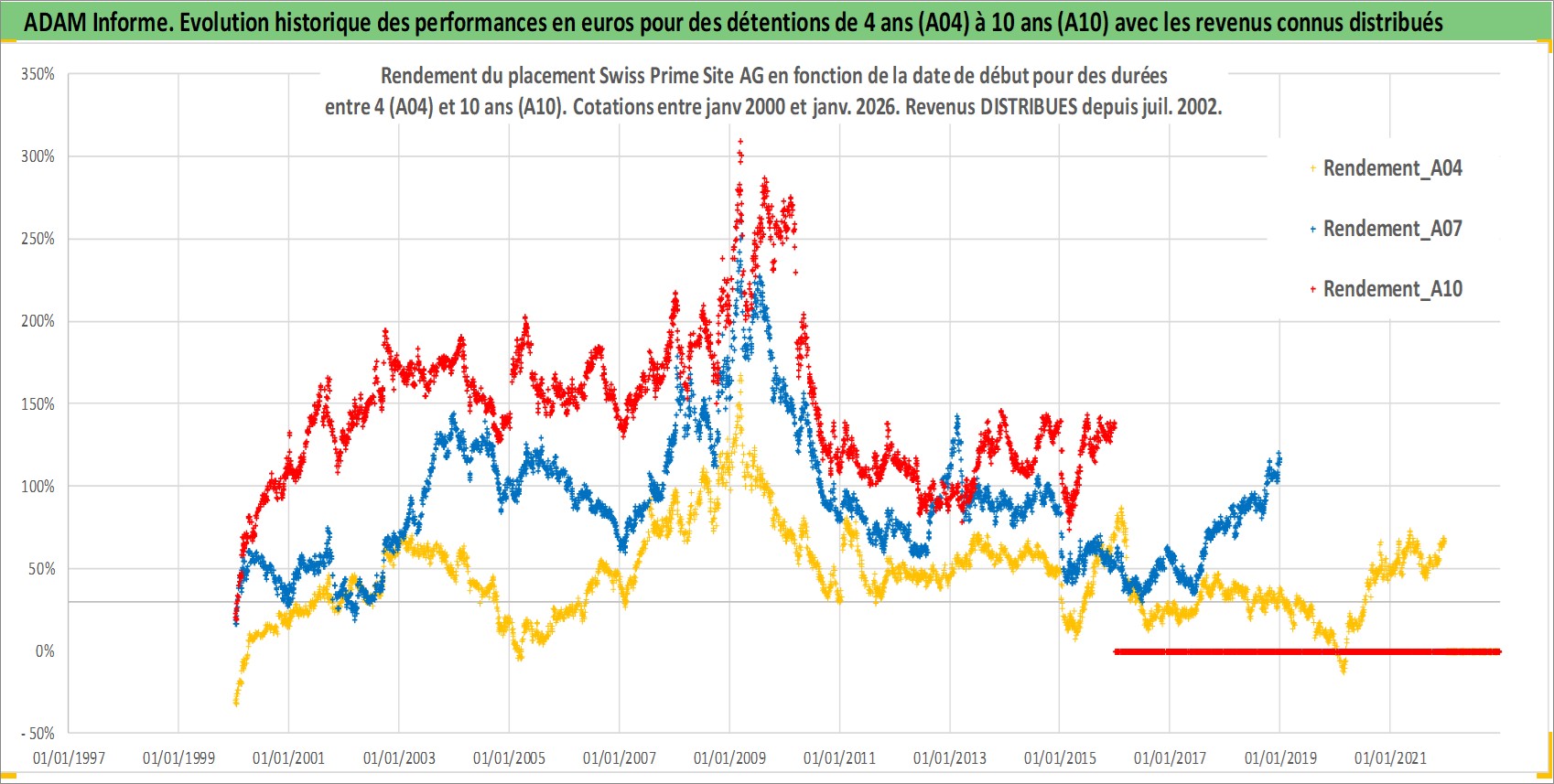 Site dédié aux investisseursPage dédiée sur site financeAnalyse des valorisations hebdomadaires de l'action Swiss Prime Site AG. Cet actif est cote en CHF. Les valorisations sont en contrevaleur EURO et couvrent les semaines 2000W01 a 2026W01. Les revenus de cet actif financier sont pris en compte depuis la semaine 2002W31. La note globale ESG de cet actif est estimee a 15.0 (apres rebasage entre 0 et 20).