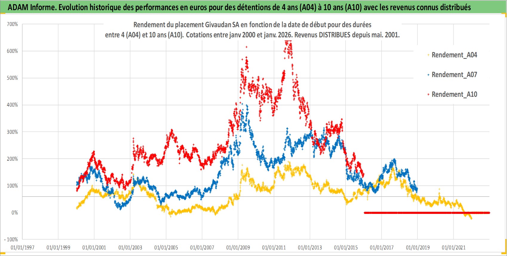 Site dédié aux investisseursPage dédiée sur site financeAnalyse des valorisations hebdomadaires de l'action Givaudan SA. Cet actif est cote en CHF. Les valorisations sont en contrevaleur EURO et couvrent les semaines 2000W01 a 2026W01. Les revenus de cet actif financier sont pris en compte depuis la semaine 2001W21. La note globale ESG de cet actif est estimee a 11.0 (apres rebasage entre 0 et 20).
