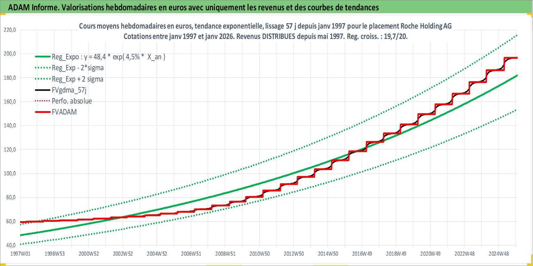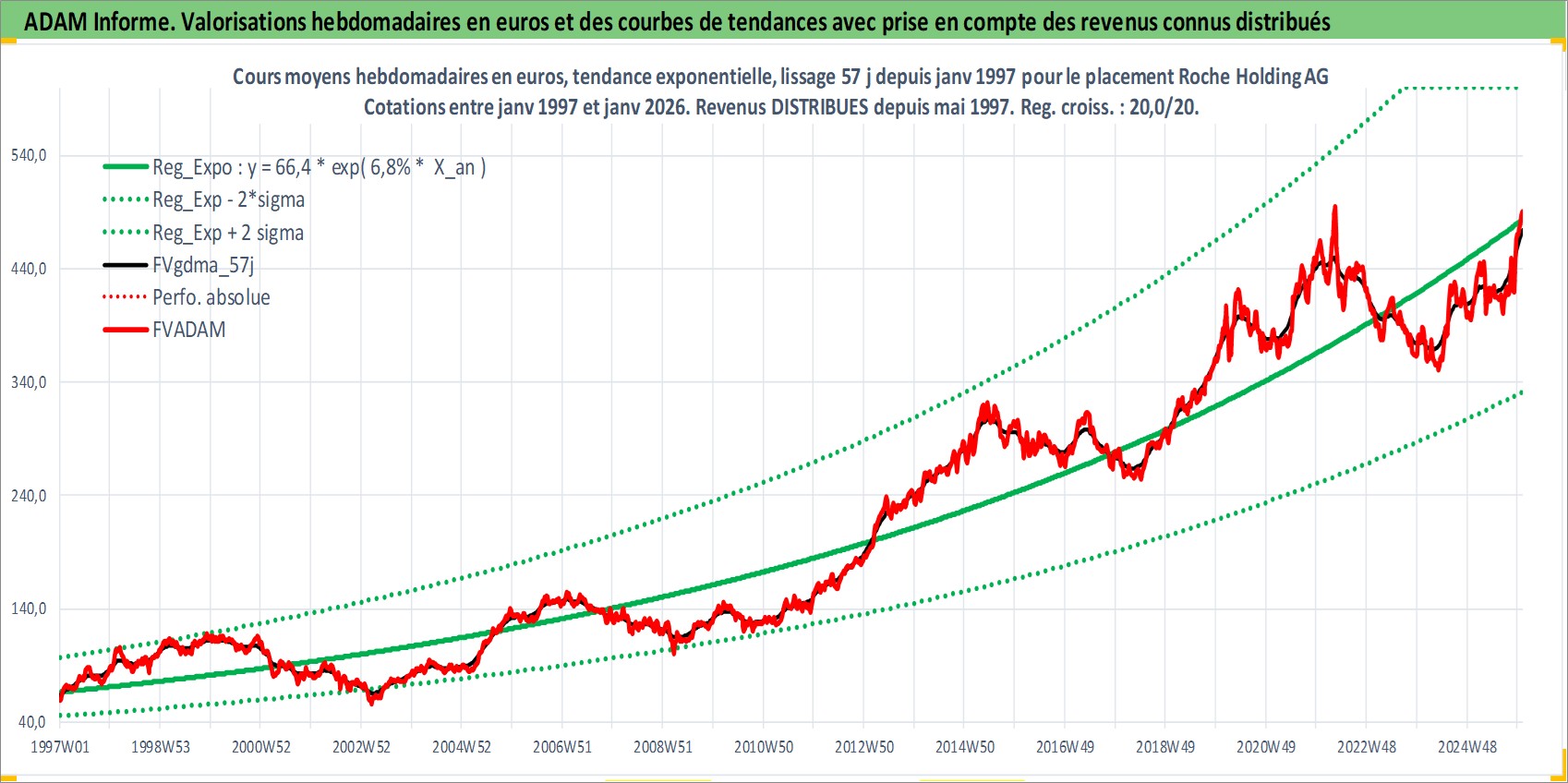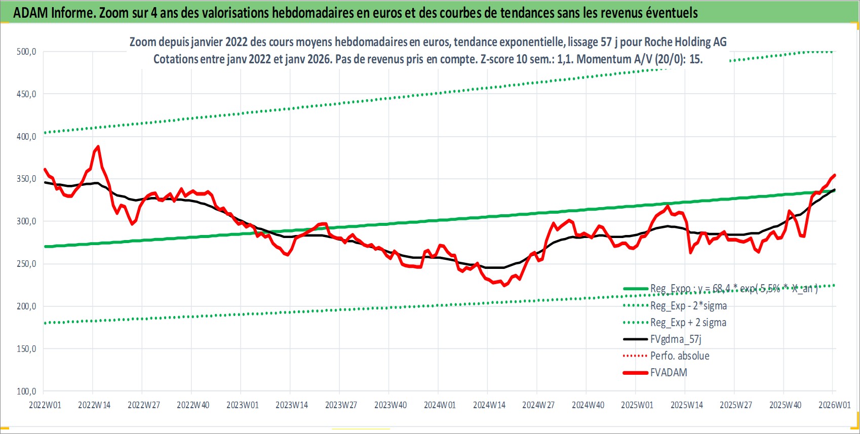 Site dédié aux investisseursPage dédiée sur site financeAnalyse des valorisations hebdomadaires de l'action Roche Holding AG. Cet actif est cote en CHF. Les valorisations sont en contrevaleur EURO et couvrent les semaines 1997W01 a 2026W01. Les revenus de cet actif financier sont pris en compte depuis la semaine 1997W19. La note globale ESG de cet actif est estimee a 8.0 (apres rebasage entre 0 et 20).