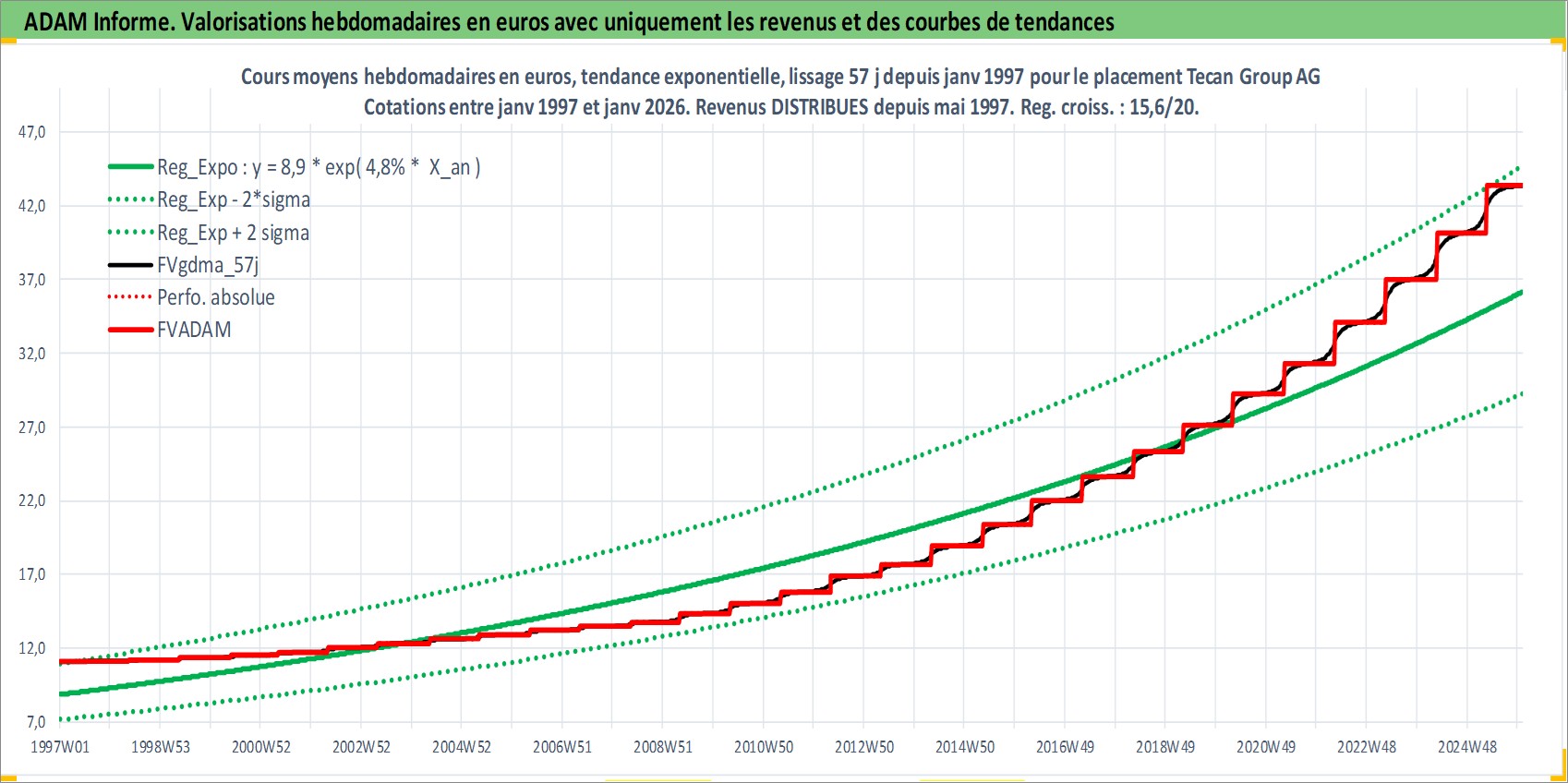 Site dédié aux investisseursPage dédiée sur site financeAnalyse des valorisations hebdomadaires de l'action Tecan Group AG. Cet actif est cote en CHF. Les valorisations sont en contrevaleur EURO et couvrent les semaines 1997W01 a 2026W01. Les revenus de cet actif financier sont pris en compte depuis la semaine 1997W21. La note ESG de cet actif n'est pas connue.