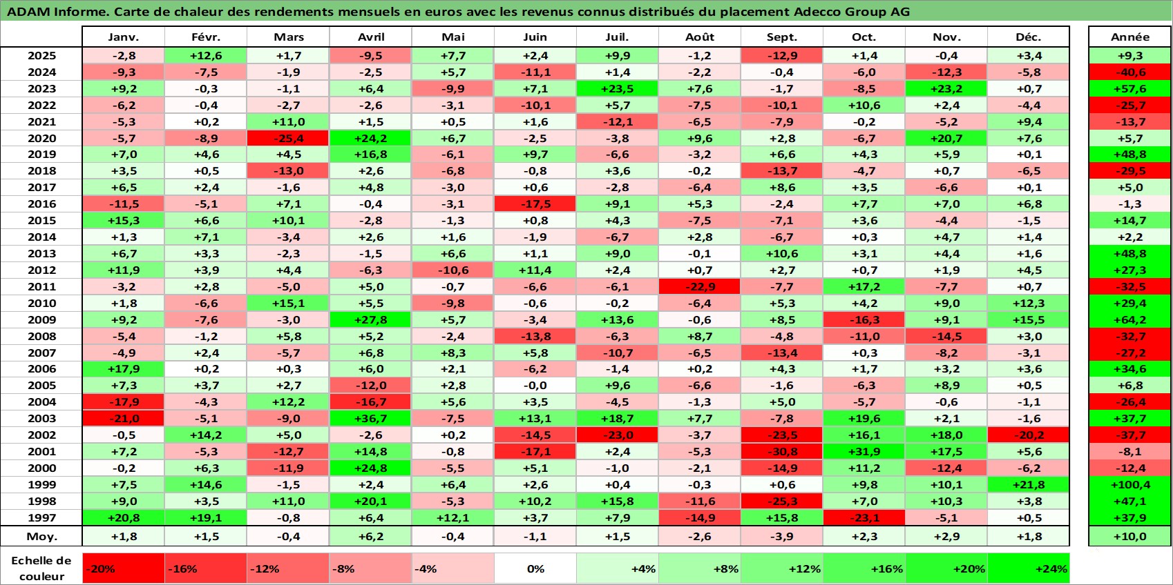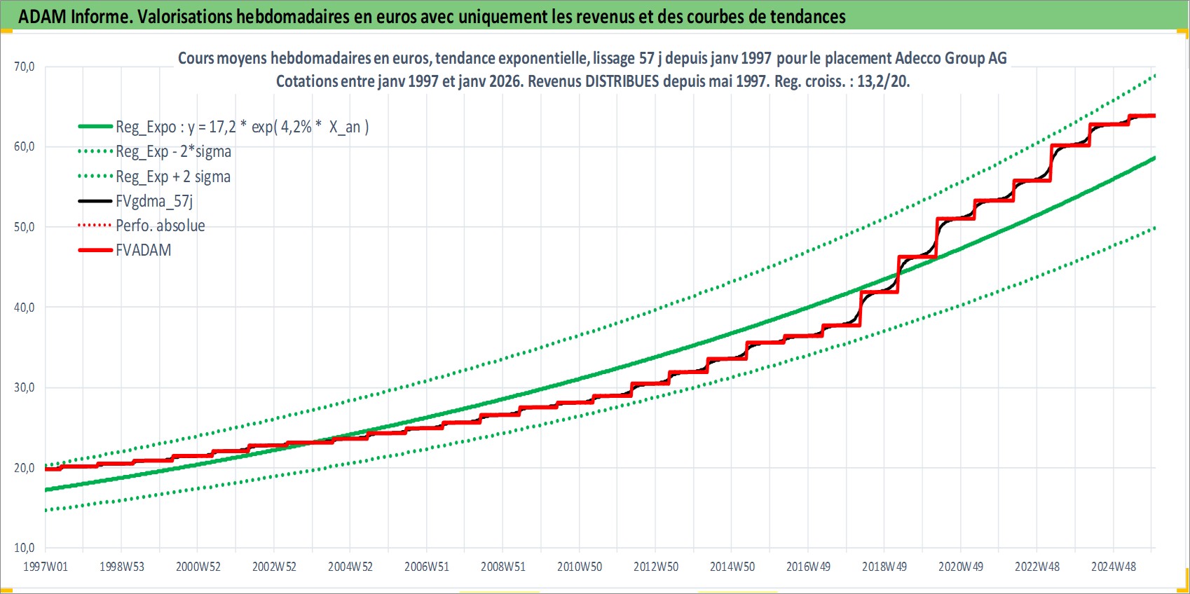 Site dédié aux investisseursPage dédiée sur site financeAnalyse des valorisations hebdomadaires de l'action Adecco Group AG. Cet actif est cote en CHF. Les valorisations sont en contrevaleur EURO et couvrent les semaines 1997W01 a 2026W01. Les revenus de cet actif financier sont pris en compte depuis la semaine 1997W22. La note globale ESG de cet actif est estimee a 17.0 (apres rebasage entre 0 et 20).