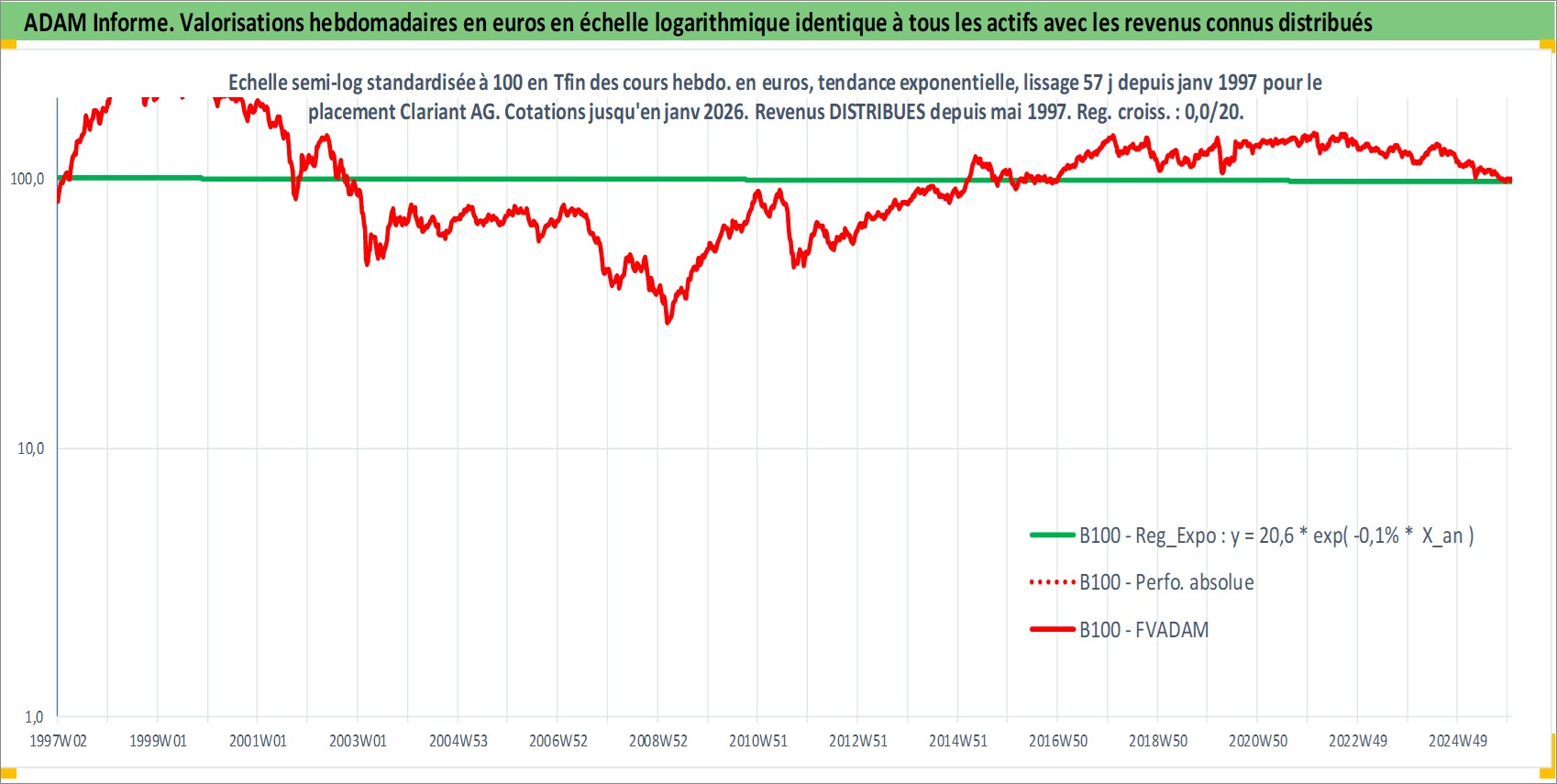 Site dédié aux investisseursPage dédiée sur site financeAnalyse des valorisations hebdomadaires de l'action Clariant AG. Cet actif est cote en CHF. Les valorisations sont en contrevaleur EURO et couvrent les semaines 1997W01 a 2026W01. Les revenus de cet actif financier sont pris en compte depuis la semaine 1997W19. La note globale ESG de cet actif est estimee a 10.0 (apres rebasage entre 0 et 20).
