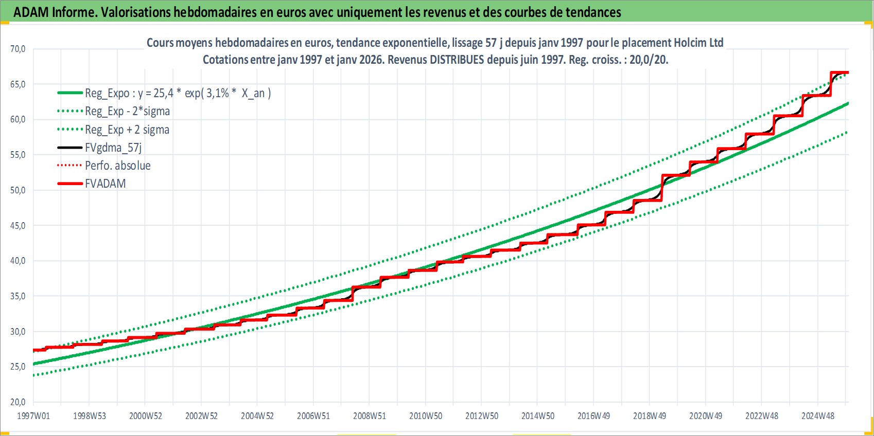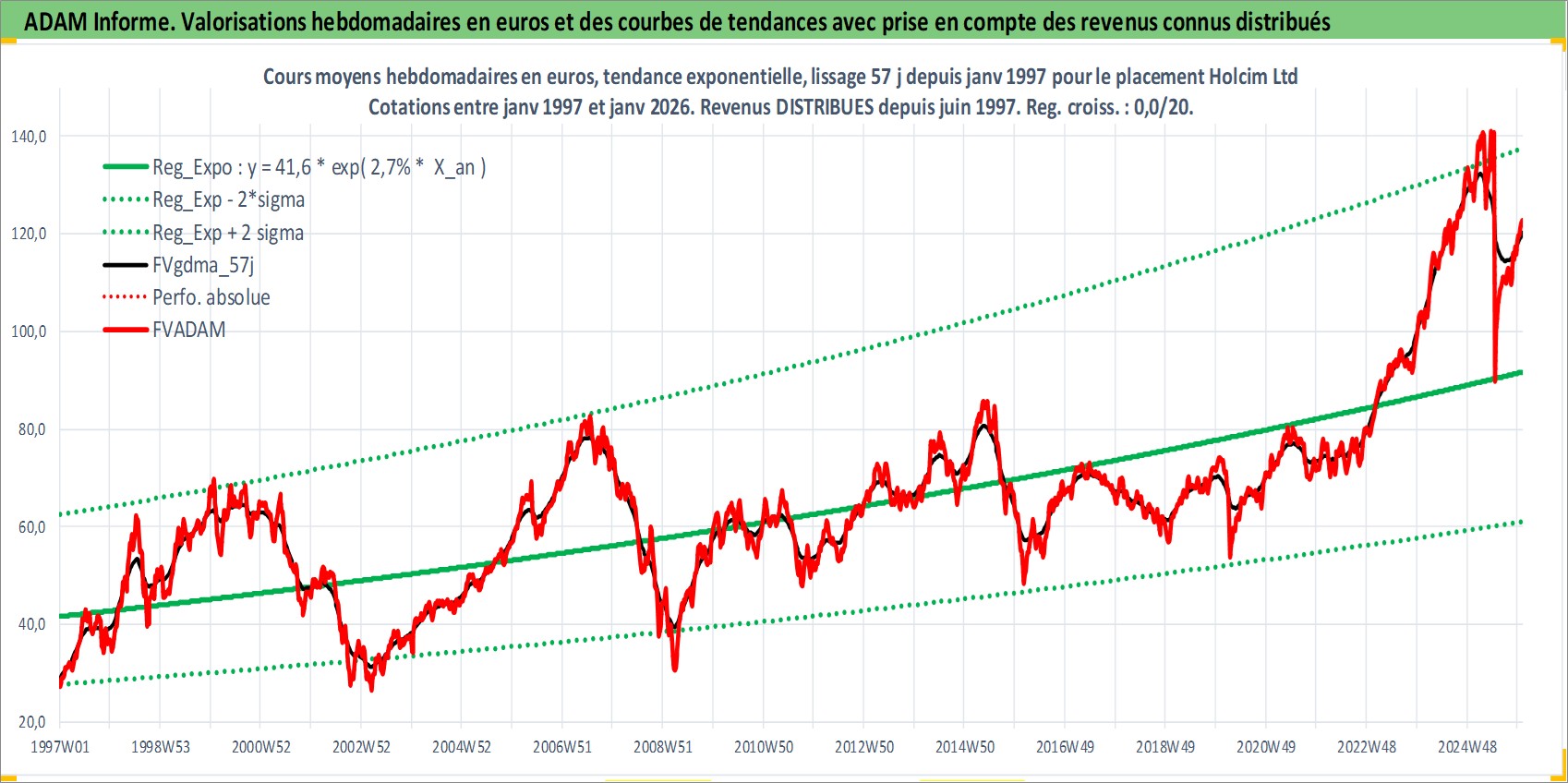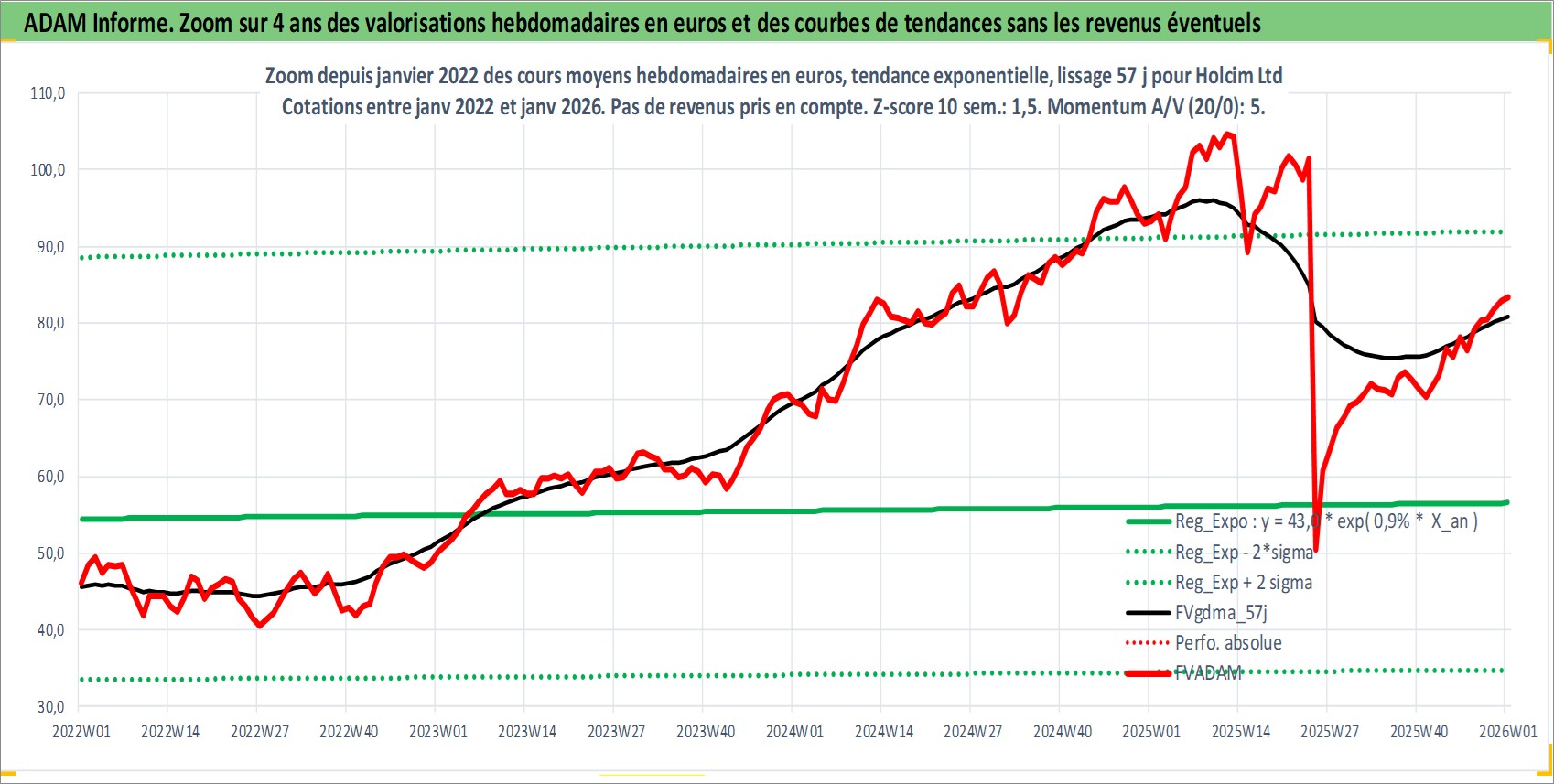 Site dédié aux investisseursPage dédiée sur site financeAnalyse des valorisations hebdomadaires de l'action Holcim Ltd. Cet actif est cote en CHF. Les valorisations sont en contrevaleur EURO et couvrent les semaines 1997W01 a 2026W01. Les revenus de cet actif financier sont pris en compte depuis la semaine 1997W24. La note globale ESG de cet actif est estimee a 10.0 (apres rebasage entre 0 et 20).