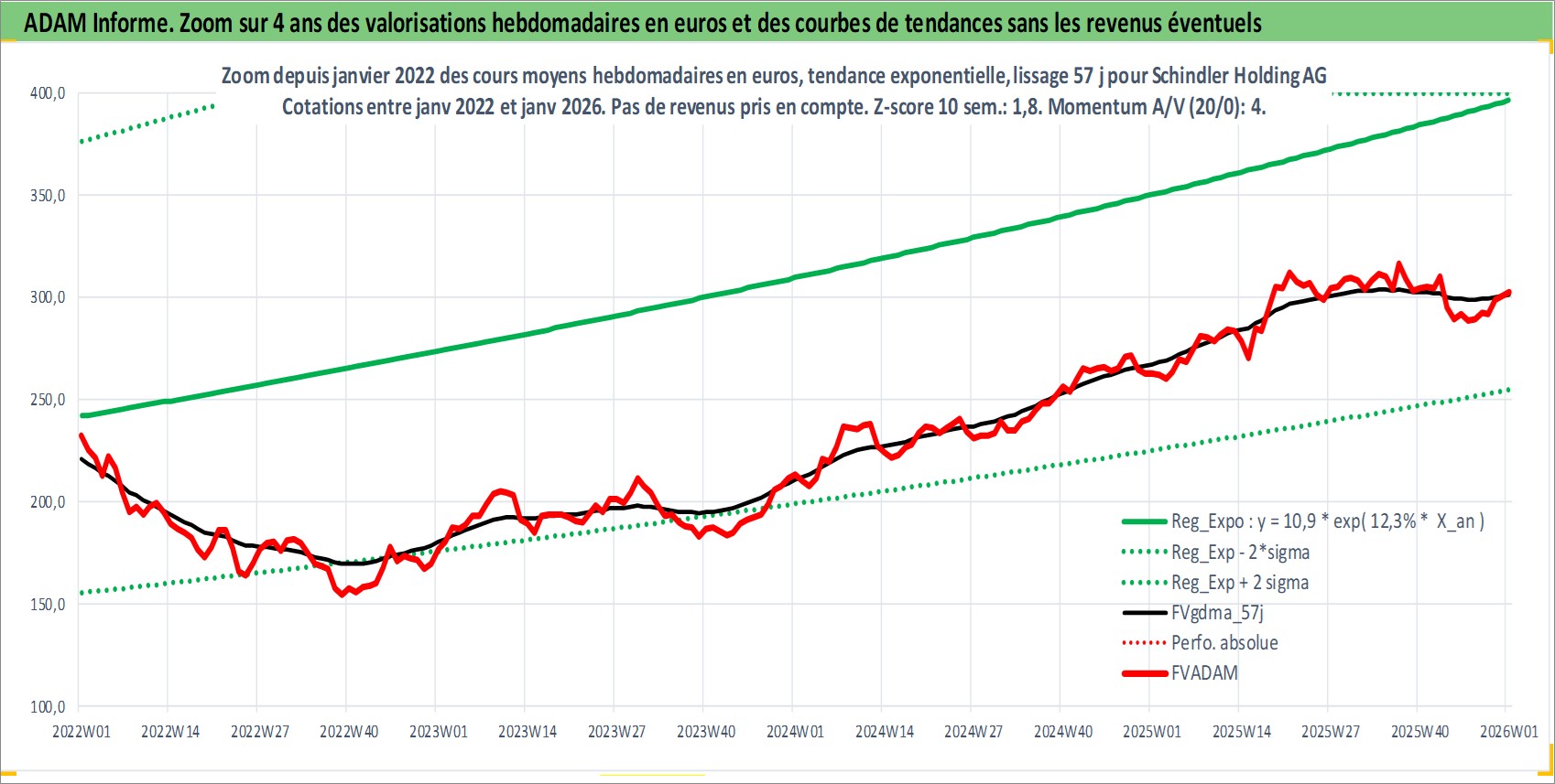 Site dédié aux investisseursPage dédiée sur site financeAnalyse des valorisations hebdomadaires de l'action Schindler Holding AG. Cet actif est cote en CHF. Les valorisations sont en contrevaleur EURO et couvrent les semaines 1997W01 a 2026W01. Les revenus de cet actif financier sont pris en compte depuis la semaine 1997W17. La note ESG de cet actif n'est pas connue.