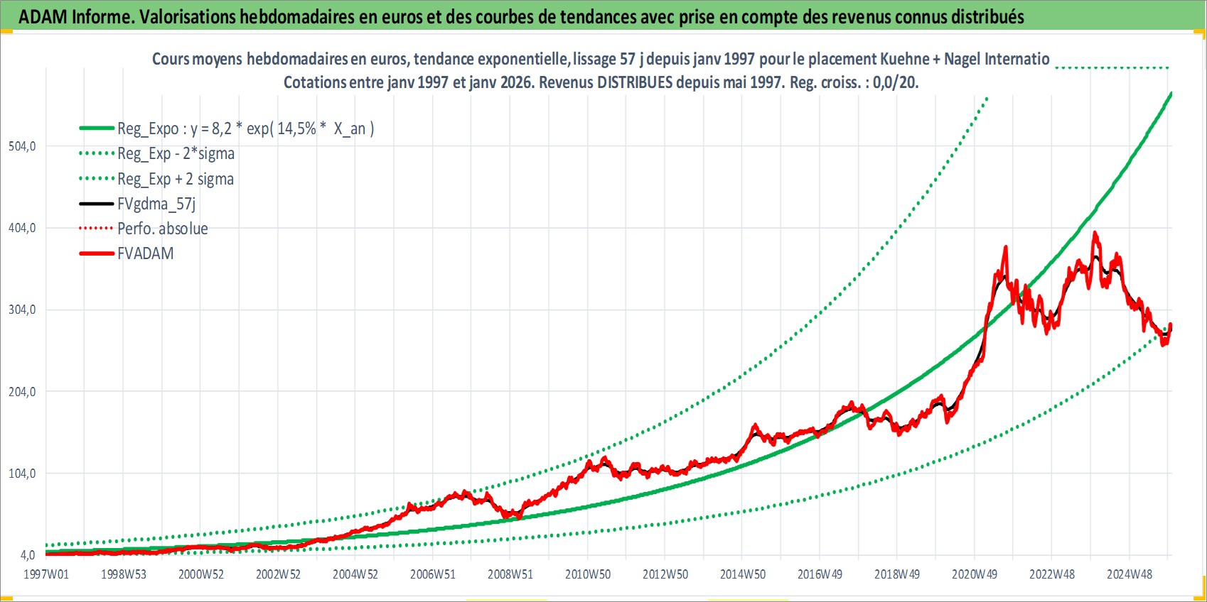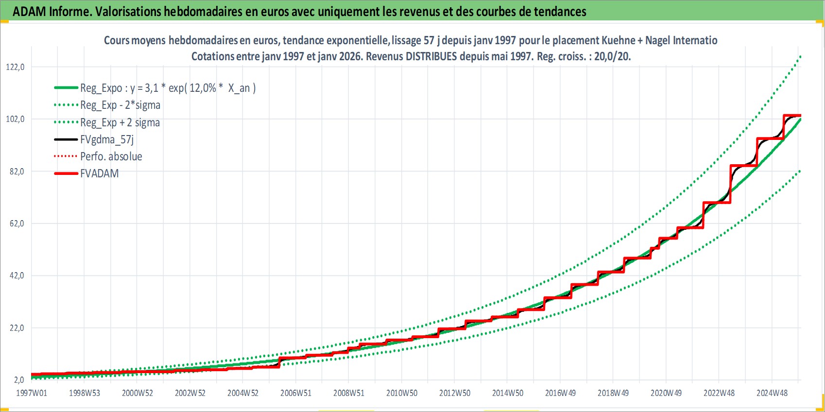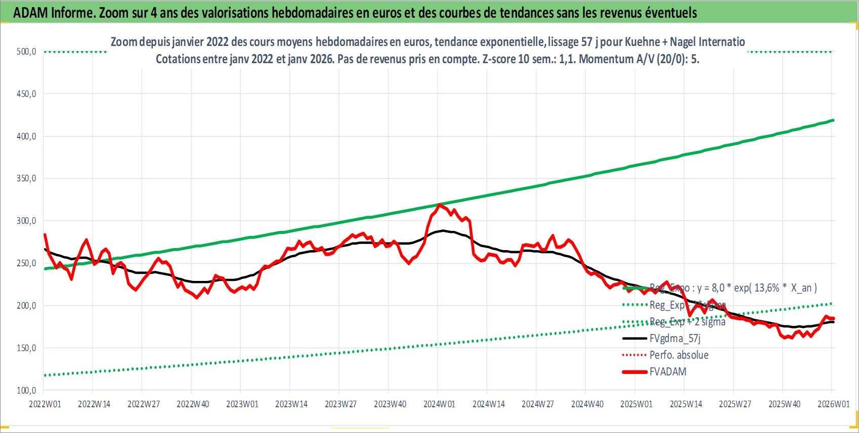 Site dédié aux investisseursPage dédiée sur site financeAnalyse des valorisations hebdomadaires de l'action Kuehne + Nagel International AG. Cet actif est cote en CHF. Les valorisations sont en contrevaleur EURO et couvrent les semaines 1997W01 a 2026W01. Les revenus de cet actif financier sont pris en compte depuis la semaine 1997W20. La note globale ESG de cet actif est estimee a 11.0 (apres rebasage entre 0 et 20).