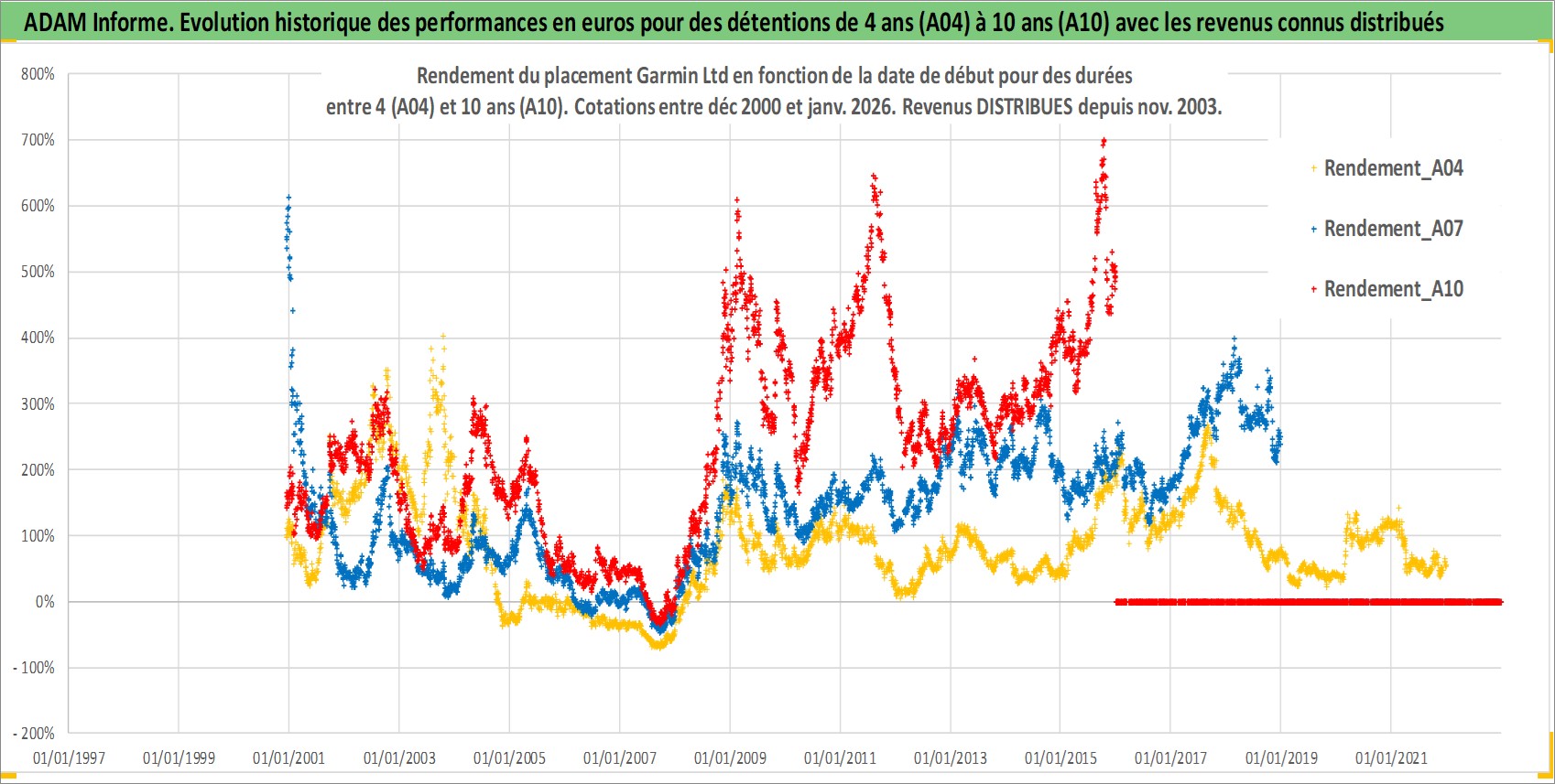 Site dédié aux investisseursPage dédiée sur site financeAnalyse des valorisations hebdomadaires de l'action Garmin Ltd. Cet actif est cote en USD. Les valorisations sont en contrevaleur EURO et couvrent les semaines 2000W49 a 2026W01. Les revenus de cet actif financier sont pris en compte depuis la semaine 2003W48. La note globale ESG de cet actif est estimee a 11.0 (apres rebasage entre 0 et 20).
