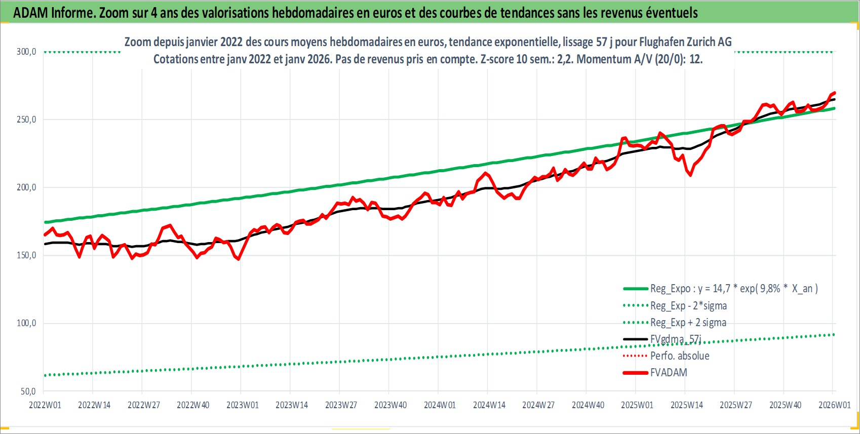 Site dédié aux investisseursPage dédiée sur site financeAnalyse des valorisations hebdomadaires de l'action Flughafen Zurich AG. Cet actif est cote en CHF. Les valorisations sont en contrevaleur EURO et couvrent les semaines 1997W01 a 2026W01. Les revenus de cet actif financier sont pris en compte depuis la semaine 1997W23. La note globale ESG de cet actif est estimee a 10.0 (apres rebasage entre 0 et 20).