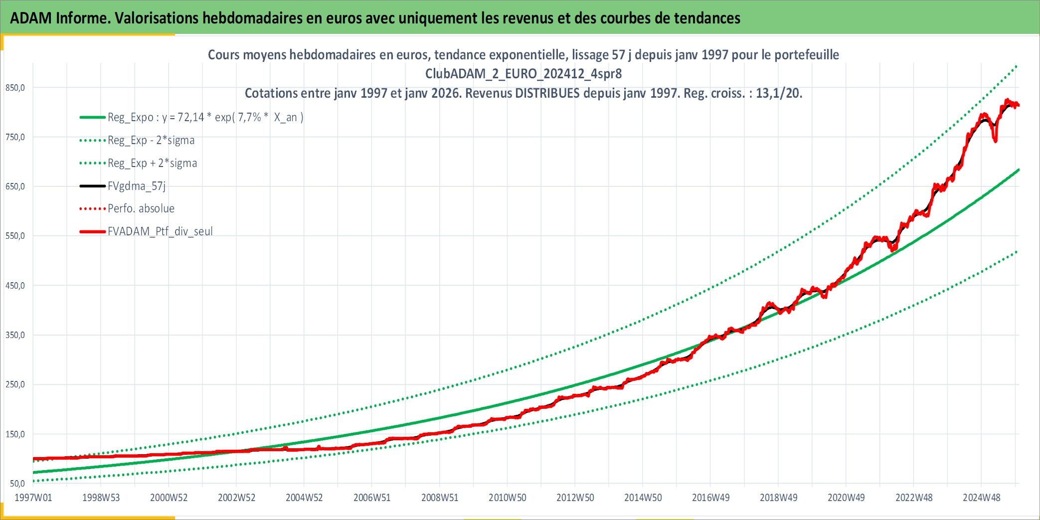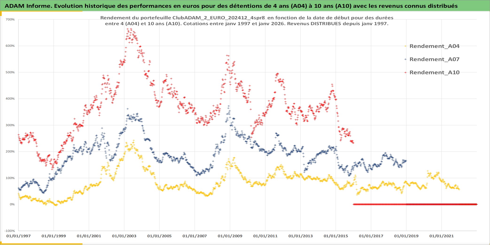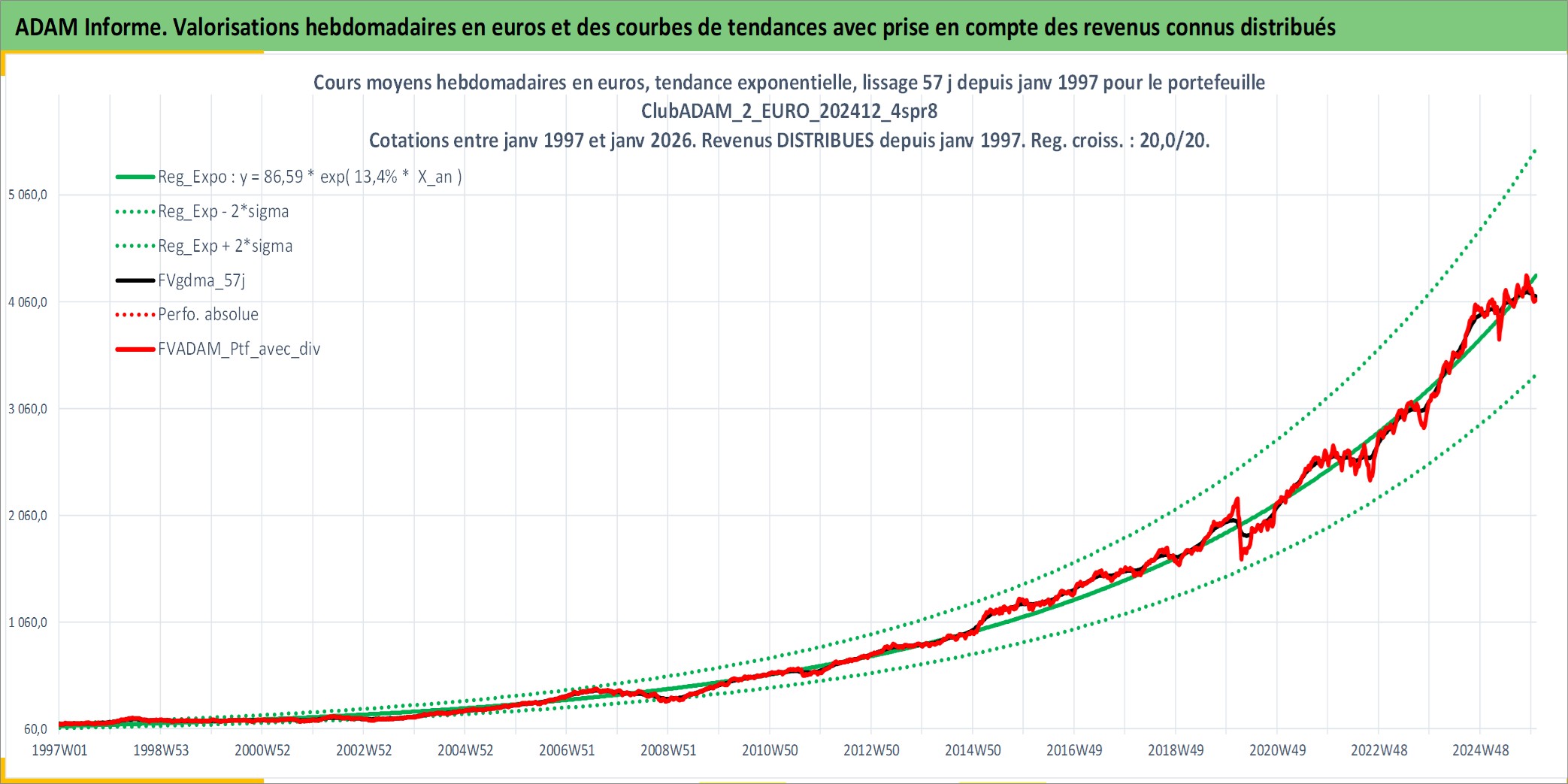 Site dédié aux investisseursPage dédiée sur site financeAnalyse des valorisations hebdomadaires du portefeuille ClubADAM_2_EURO_202412_4spr8_5actifs avec un profil P6_PurActions. Ce portefeuille est cote en EUR. Les valorisations couvrent les semaines 1997W01 a 2026W01. Les revenus de cet actif financier sont pris en compte depuis la semaine 1997W01. La note globale ESG de cet actif est estimee a 12.0 (apres rebasage entre 0 et 20).