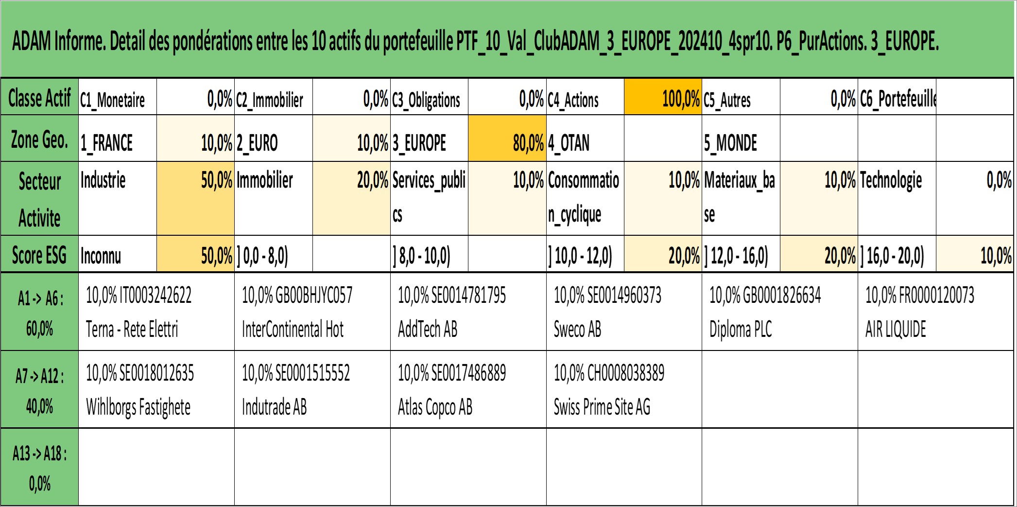 Site dédié aux investisseursPage dédiée sur site financeAnalyse des valorisations hebdomadaires du portefeuille ClubADAM_3_EUROPE_202410_4spr10_10actifs avec un profil P6_PurActions. Ce portefeuille est cote en EUR. Les valorisations couvrent les semaines 1997W01 a 2026W01. Les revenus de cet actif financier sont pris en compte depuis la semaine 1997W01. La note globale ESG de cet actif est estimee a 13.8 (apres rebasage entre 0 et 20).