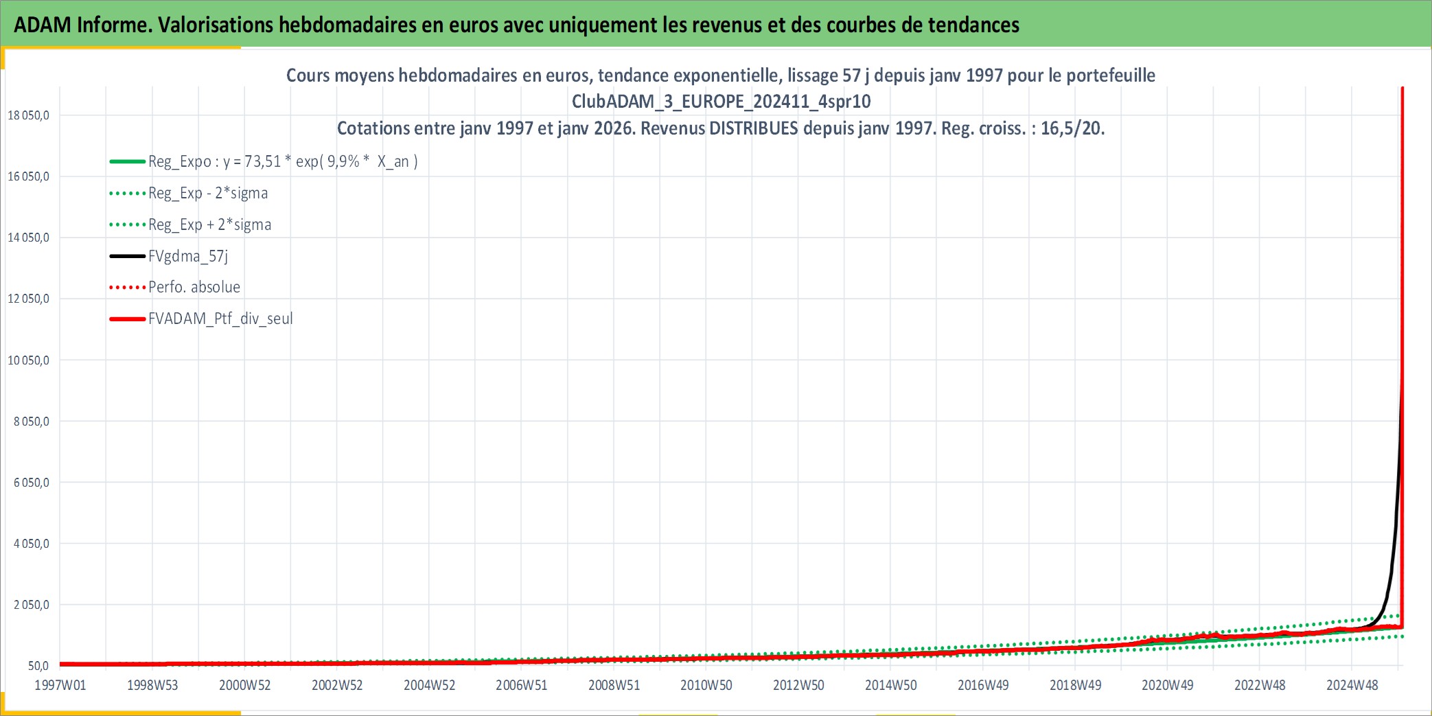 Site dédié aux investisseursPage dédiée sur site financeAnalyse des valorisations hebdomadaires du portefeuille ClubADAM_3_EUROPE_202411_4spr10_10actifs avec un profil P6_PurActions. Ce portefeuille est cote en EUR. Les valorisations couvrent les semaines 1997W01 a 2026W01. Les revenus de cet actif financier sont pris en compte depuis la semaine 1997W01. La note globale ESG de cet actif est estimee a 13.8 (apres rebasage entre 0 et 20).