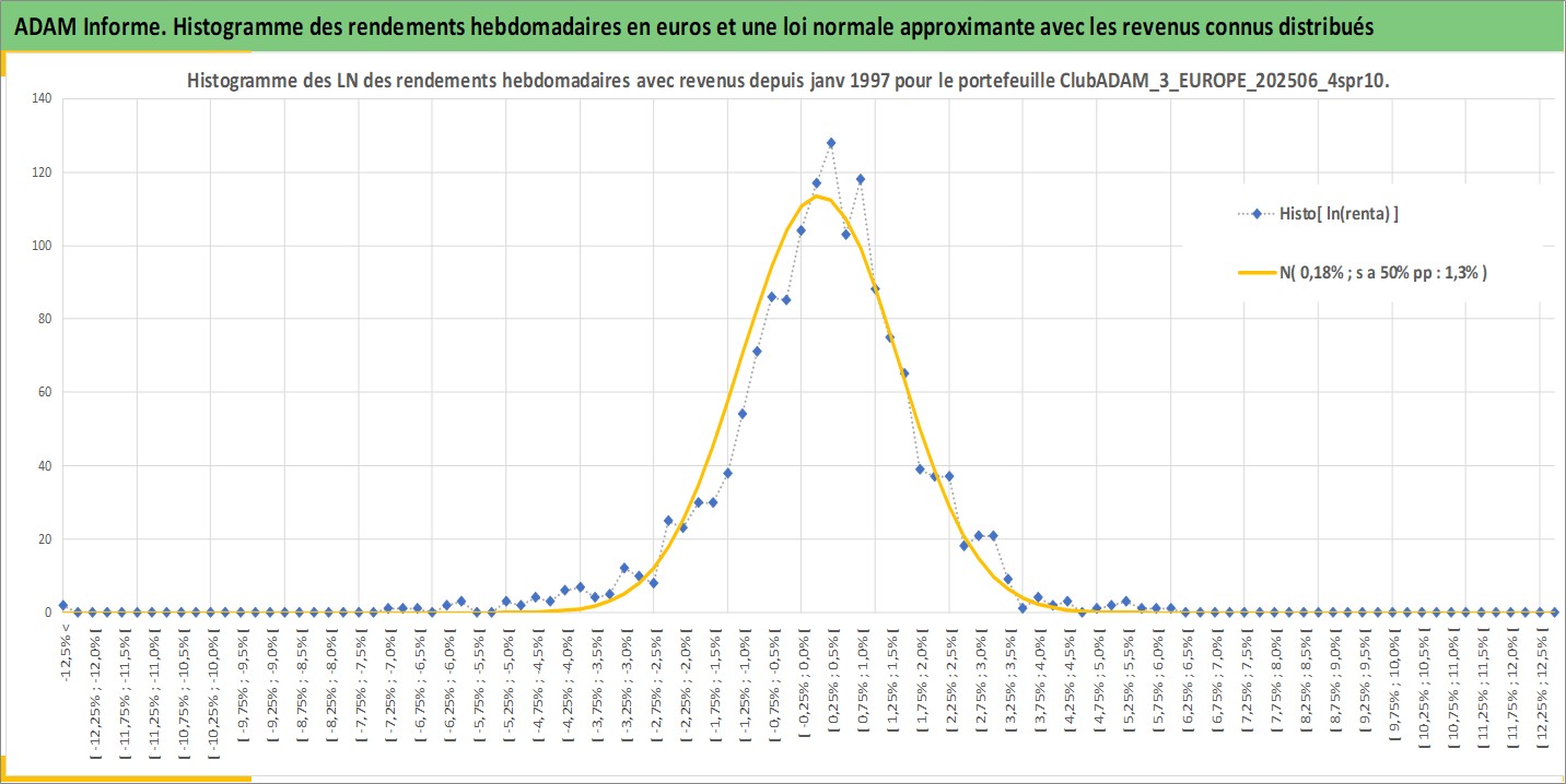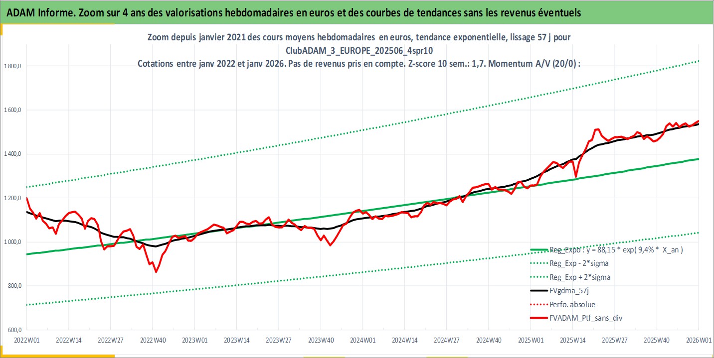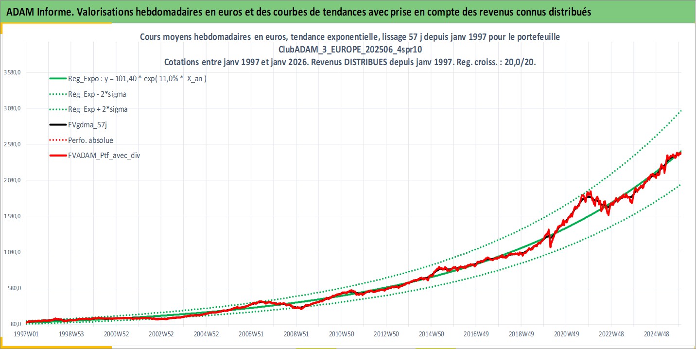 Site dédié aux investisseursPage dédiée sur site financeAnalyse des valorisations hebdomadaires du portefeuille ClubADAM_3_EUROPE_202506_4spr10_11actifs avec un profil P6_PurActions. Ce portefeuille est cote en EUR. Les valorisations couvrent les semaines 1997W01 a 2026W01. Les revenus de cet actif financier sont pris en compte depuis la semaine 1997W01. La note globale ESG de cet actif est estimee a 14.4 (apres rebasage entre 0 et 20).