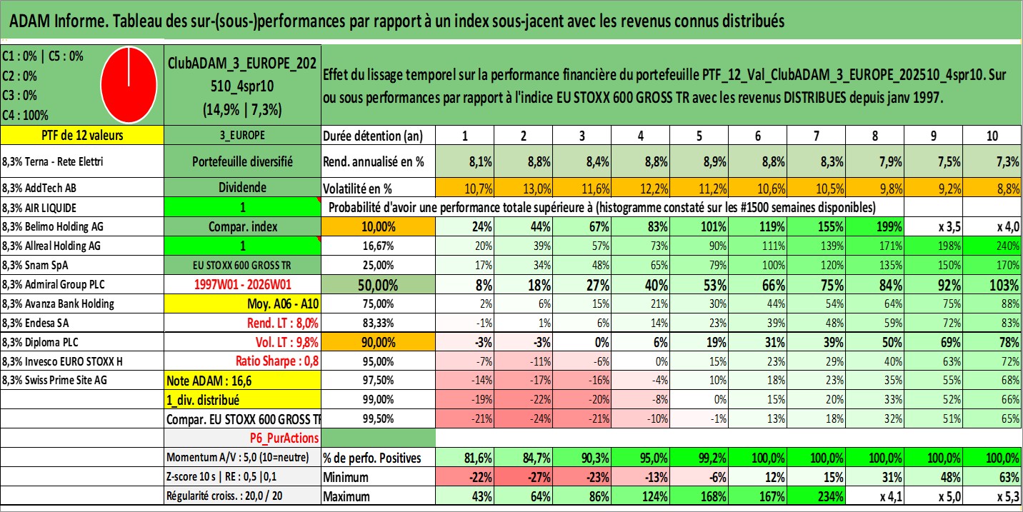 Site dédié aux investisseursPage dédiée sur site financeAnalyse des valorisations hebdomadaires du portefeuille ClubADAM_3_EUROPE_202510_4spr10_12actifs avec un profil P6_PurActions. Ce portefeuille est cote en EUR. Les valorisations couvrent les semaines 1997W01 a 2026W01. Les revenus de cet actif financier sont pris en compte depuis la semaine 1997W01. La note globale ESG de cet actif est estimee a 13.5 (apres rebasage entre 0 et 20).