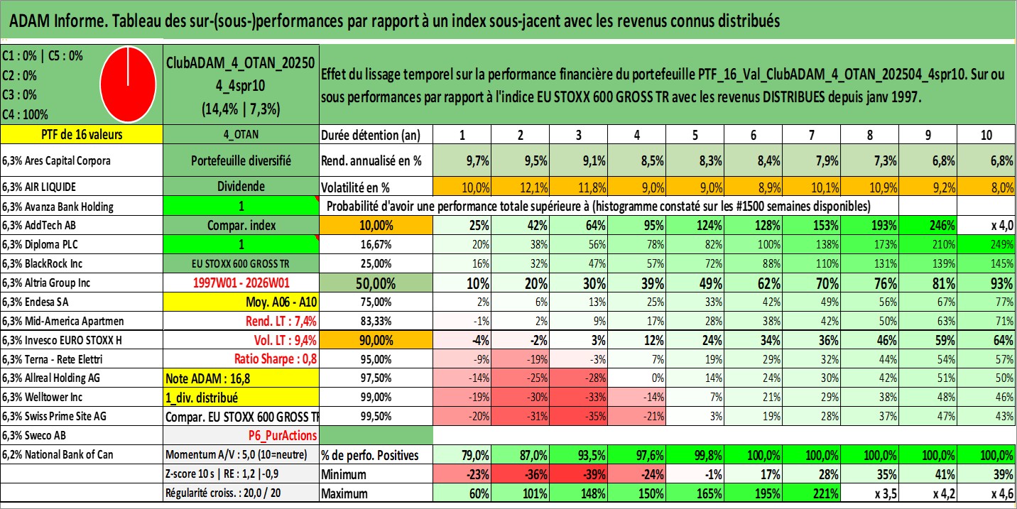 Site dédié aux investisseursPage dédiée sur site financeAnalyse des valorisations hebdomadaires du portefeuille ClubADAM_4_OTAN_202504_4spr10_16actifs avec un profil P6_PurActions. Ce portefeuille est cote en EUR. Les valorisations couvrent les semaines 1997W01 a 2026W01. Les revenus de cet actif financier sont pris en compte depuis la semaine 1997W01. La note globale ESG de cet actif est estimee a 13.1 (apres rebasage entre 0 et 20).