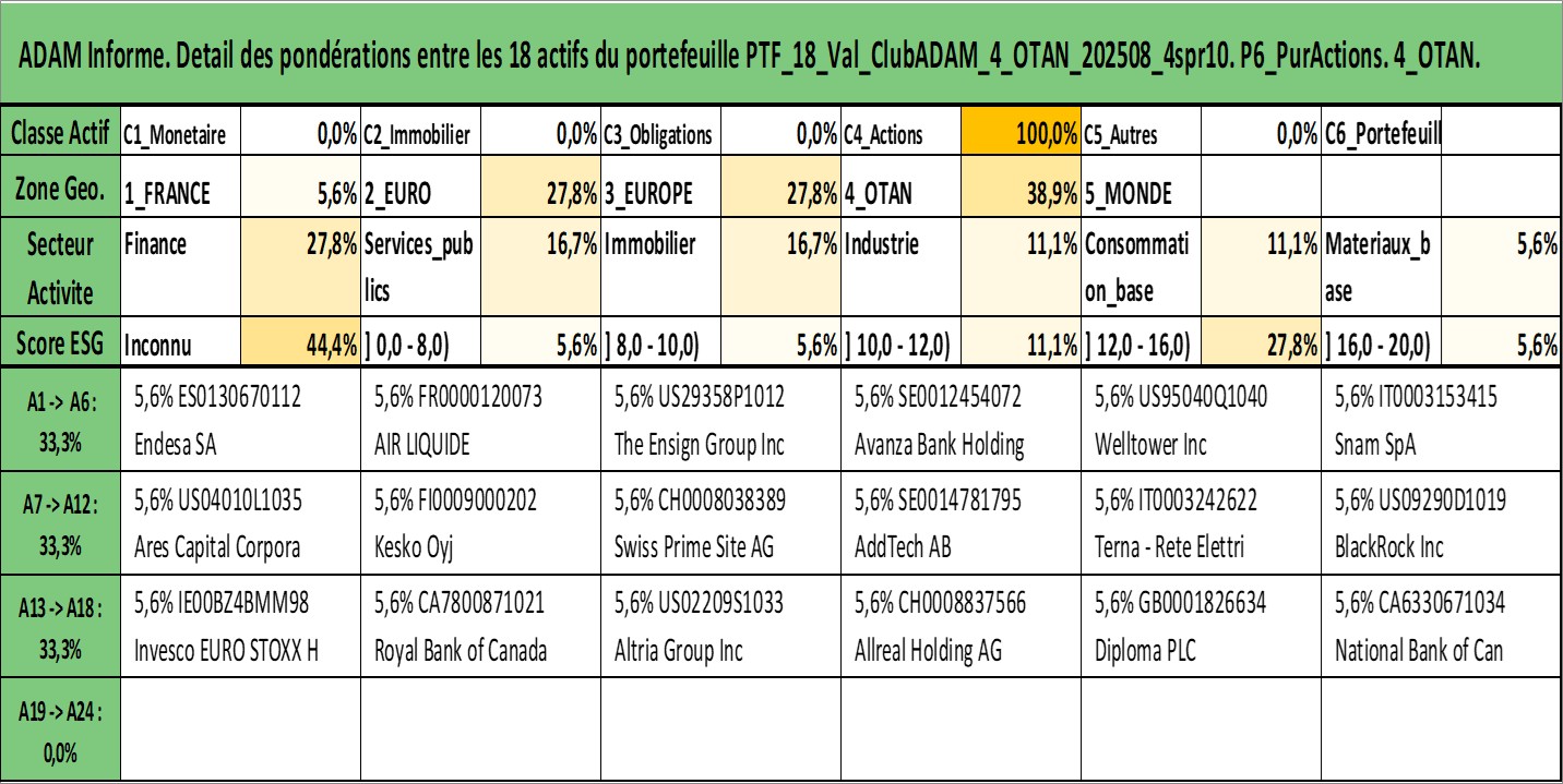 Site dédié aux investisseursPage dédiée sur site financeAnalyse des valorisations hebdomadaires du portefeuille ClubADAM_4_OTAN_202508_4spr10_18actifs avec un profil P6_PurActions. Ce portefeuille est cote en EUR. Les valorisations couvrent les semaines 1997W01 a 2026W01. Les revenus de cet actif financier sont pris en compte depuis la semaine 1997W01. La note globale ESG de cet actif est estimee a 12.9 (apres rebasage entre 0 et 20).