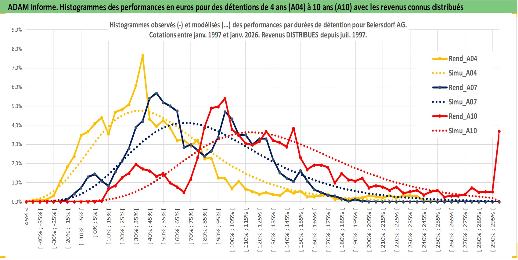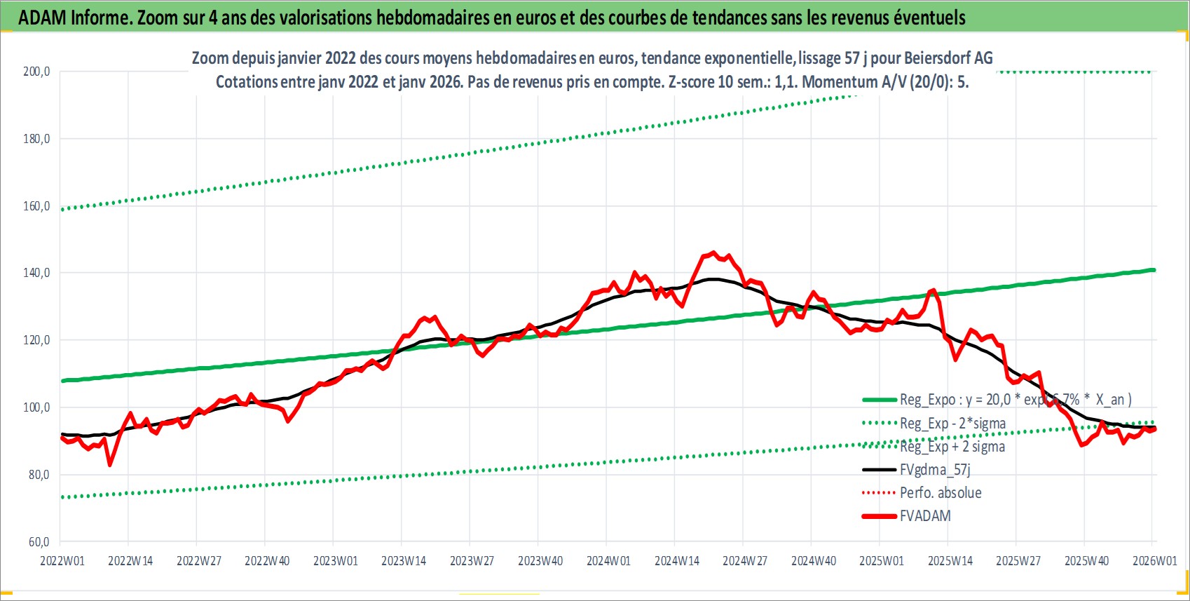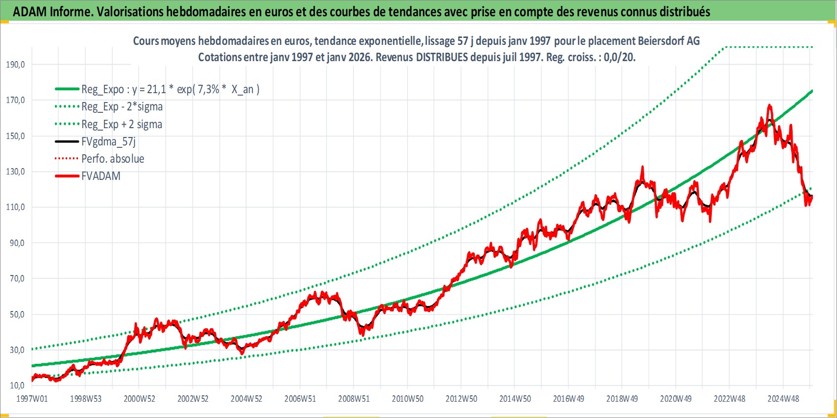 Site dédié aux investisseursPage dédiée sur site financeAnalyse des valorisations hebdomadaires de l'action Beiersdorf AG. Cet actif est cote en EUR. Les valorisations couvrent les semaines 1997W01 a 2026W01. Les revenus de cet actif financier sont pris en compte depuis la semaine 1997W27. La note globale ESG de cet actif est estimee a 6.0 (apres rebasage entre 0 et 20).