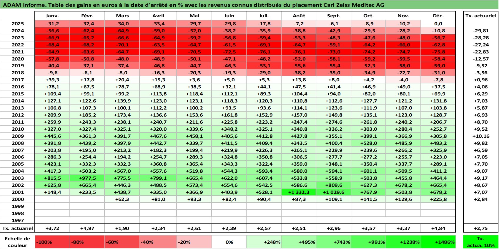 Site dédié aux investisseursPage dédiée sur site financeAnalyse des valorisations hebdomadaires de l'action Carl Zeiss Meditec AG. Cet actif est cote en EUR. Les valorisations couvrent les semaines 2000W12 a 2026W01. Les revenus de cet actif financier sont pris en compte depuis la semaine 2006W11. La note ESG de cet actif n'est pas connue.