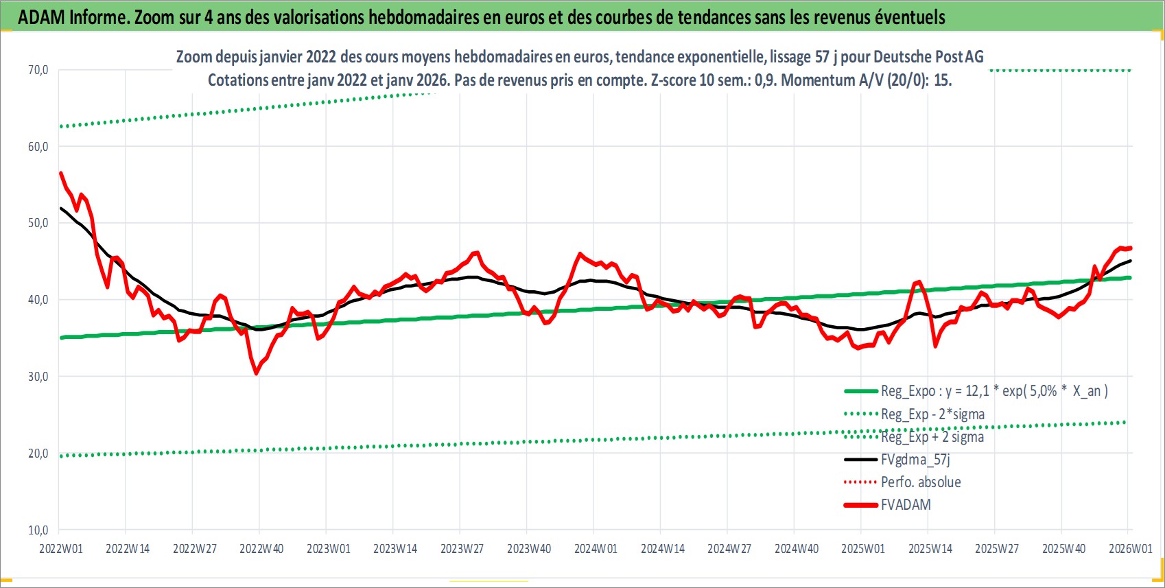 Site dédié aux investisseursPage dédiée sur site financeAnalyse des valorisations hebdomadaires de l'action Deutsche Post AG. Cet actif est cote en EUR. Les valorisations couvrent les semaines 2000W47 a 2026W01. Les revenus de cet actif financier sont pris en compte depuis la semaine 2001W26. La note ESG de cet actif n'est pas connue.