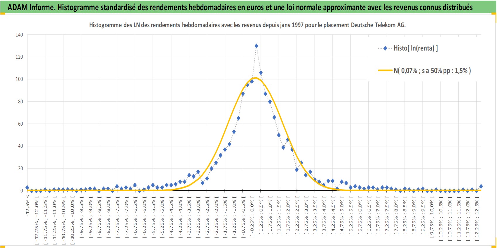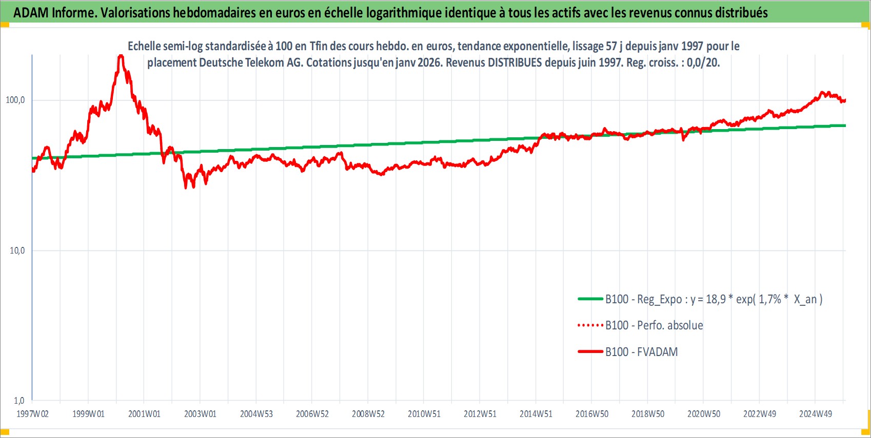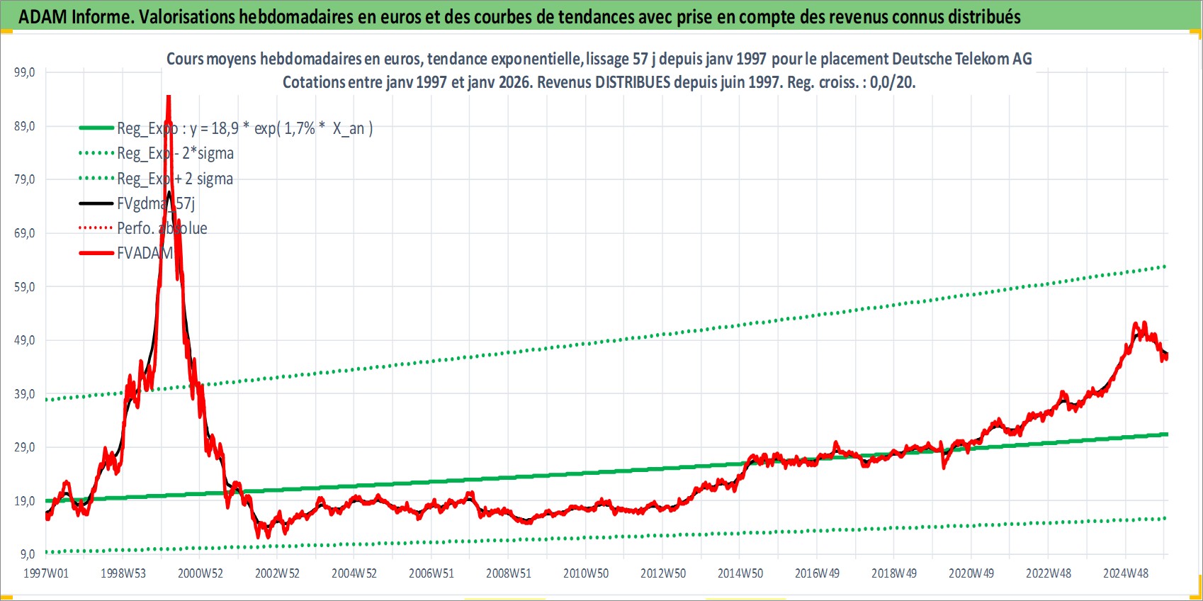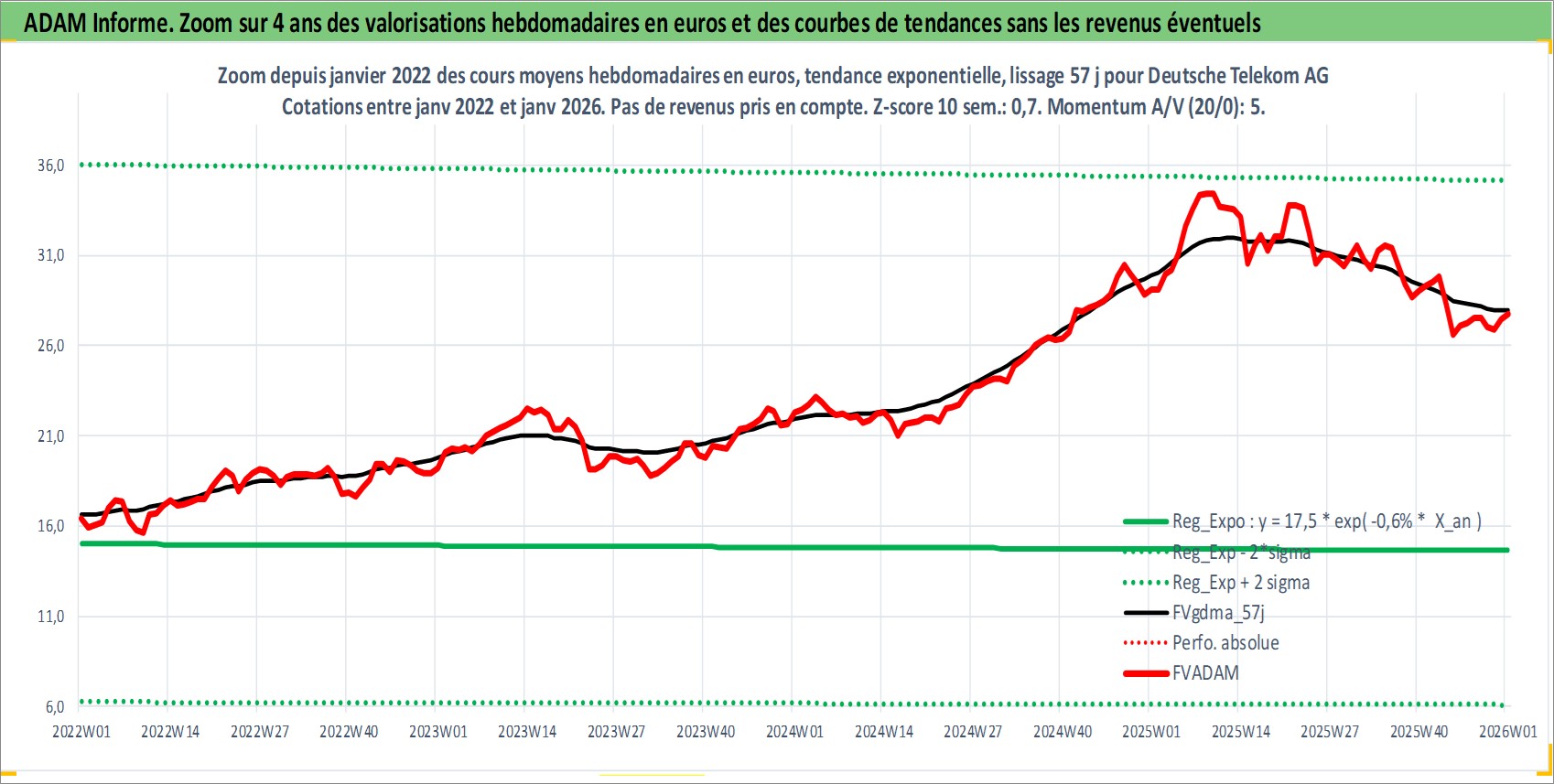 Site dédié aux investisseursPage dédiée sur site financeAnalyse des valorisations hebdomadaires de l'action Deutsche Telekom AG. Cet actif est cote en EUR. Les valorisations couvrent les semaines 1997W01 a 2026W01. Les revenus de cet actif financier sont pris en compte depuis la semaine 1997W26. La note globale ESG de cet actif est estimee a 13.0 (apres rebasage entre 0 et 20).