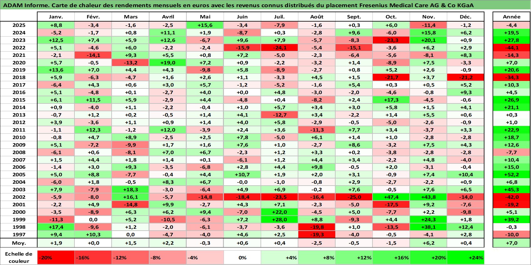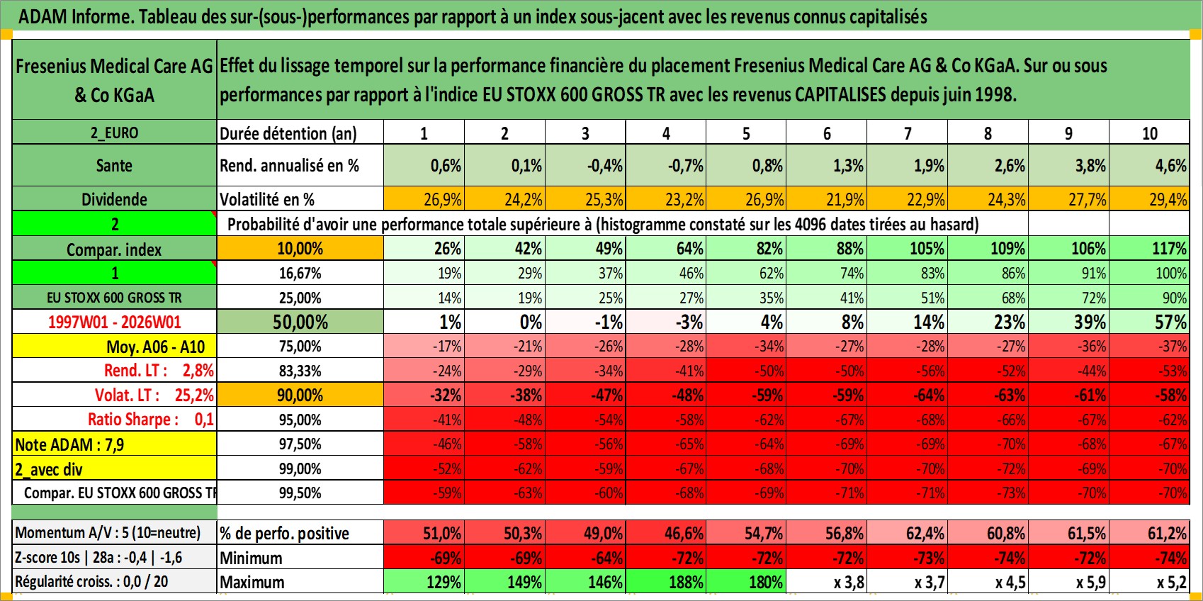Site dédié aux investisseursPage dédiée sur site financeAnalyse des valorisations hebdomadaires de l'action Fresenius Medical Care AG & Co KGaA. Cet actif est cote en EUR. Les valorisations couvrent les semaines 1997W01 a 2026W01. Les revenus de cet actif financier sont pris en compte depuis la semaine 1998W24. La note globale ESG de cet actif est estimee a 12.0 (apres rebasage entre 0 et 20).