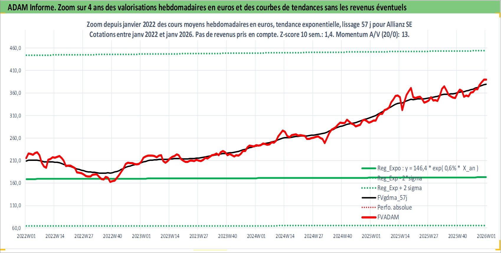 Site dédié aux investisseursPage dédiée sur site financeAnalyse des valorisations hebdomadaires de l'action Allianz SE. Cet actif est cote en EUR. Les valorisations couvrent les semaines 1997W01 a 2026W01. Les revenus de cet actif financier sont pris en compte depuis la semaine 1997W28. La note globale ESG de cet actif est estimee a 12.0 (apres rebasage entre 0 et 20).
