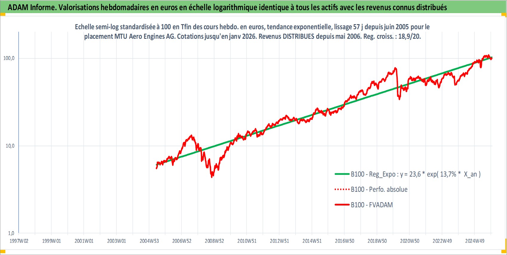 Site dédié aux investisseursPage dédiée sur site financeAnalyse des valorisations hebdomadaires de l'action MTU Aero Engines AG. Cet actif est cote en EUR. Les valorisations couvrent les semaines 2005W23 a 2026W01. Les revenus de cet actif financier sont pris en compte depuis la semaine 2006W20. La note globale ESG de cet actif est estimee a 6.0 (apres rebasage entre 0 et 20).