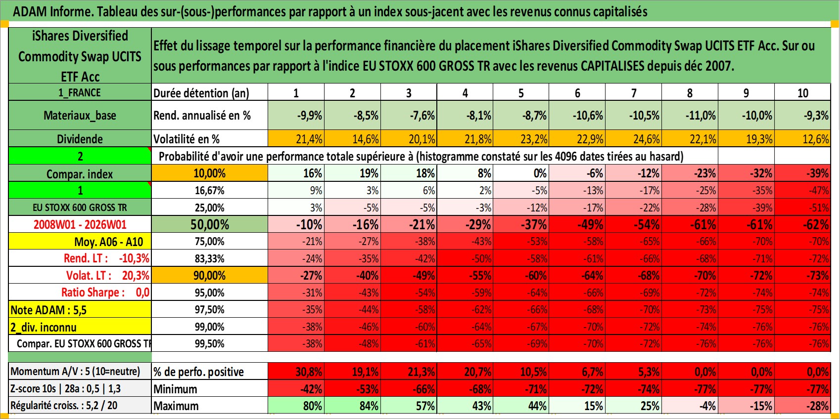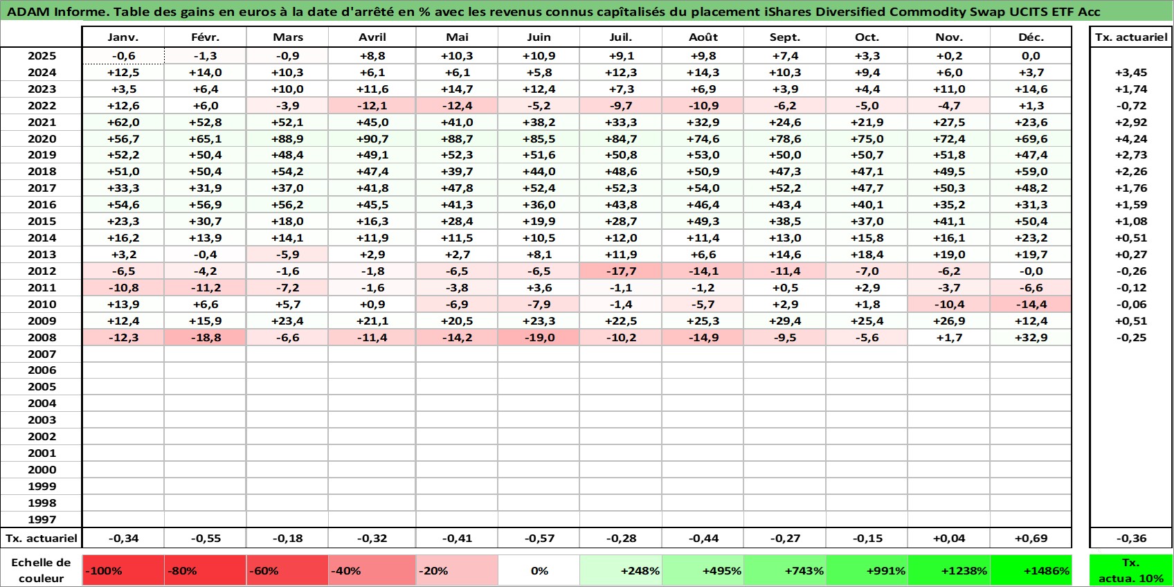 Site dédié aux investisseursPage dédiée sur site financeAnalyse des valorisations hebdomadaires du fonds iShares Diversified Commodity Swap UCITS ETF Acc. Cet actif est cote en USD. Les valorisations sont en contrevaleur EURO et couvrent les semaines 2008W01 a 2026W01. Les revenus de cet actif financier sont pris en compte depuis la semaine 2008W01. La note ESG de cet actif n'est pas connue.