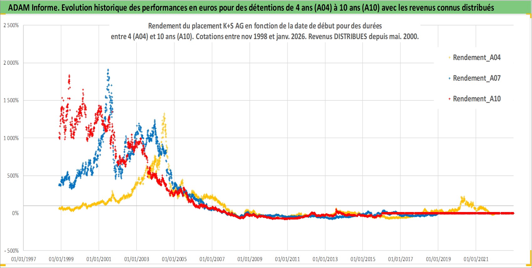 Site dédié aux investisseursPage dédiée sur site financeAnalyse des valorisations hebdomadaires de l'action K+S AG. Cet actif est cote en EUR. Les valorisations couvrent les semaines 1998W46 a 2026W01. Les revenus de cet actif financier sont pris en compte depuis la semaine 2000W19. La note ESG de cet actif n'est pas connue.