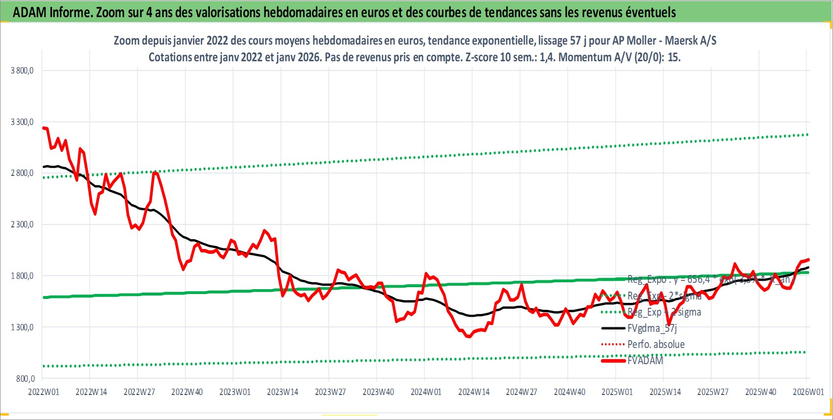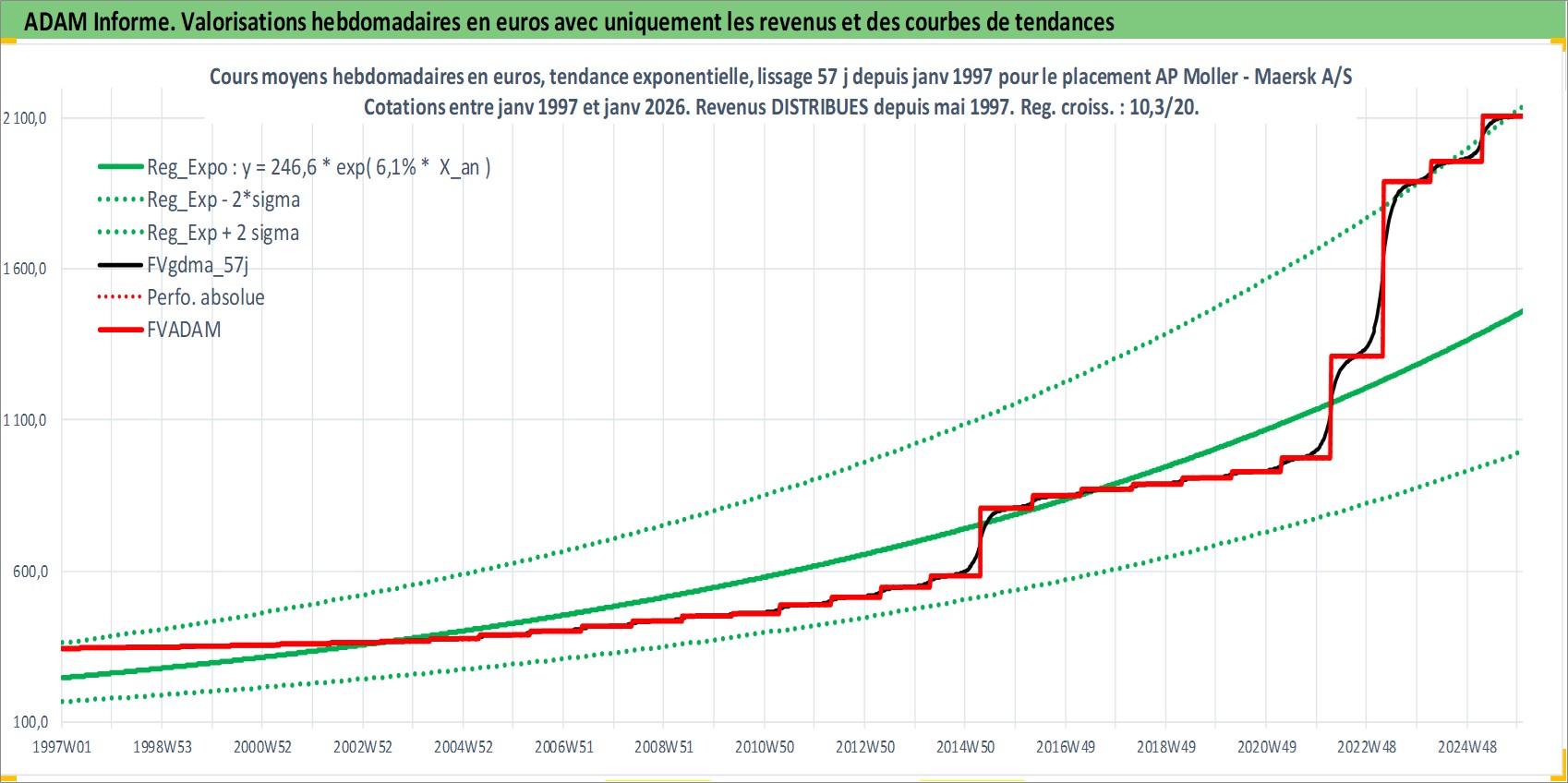 Site dédié aux investisseursPage dédiée sur site financeAnalyse des valorisations hebdomadaires de l'action AP Moller - Maersk A/S. Cet actif est cote en DKK. Les valorisations sont en contrevaleur EURO et couvrent les semaines 1997W01 a 2026W01. Les revenus de cet actif financier sont pris en compte depuis la semaine 1997W20. La note globale ESG de cet actif est estimee a 9.0 (apres rebasage entre 0 et 20).