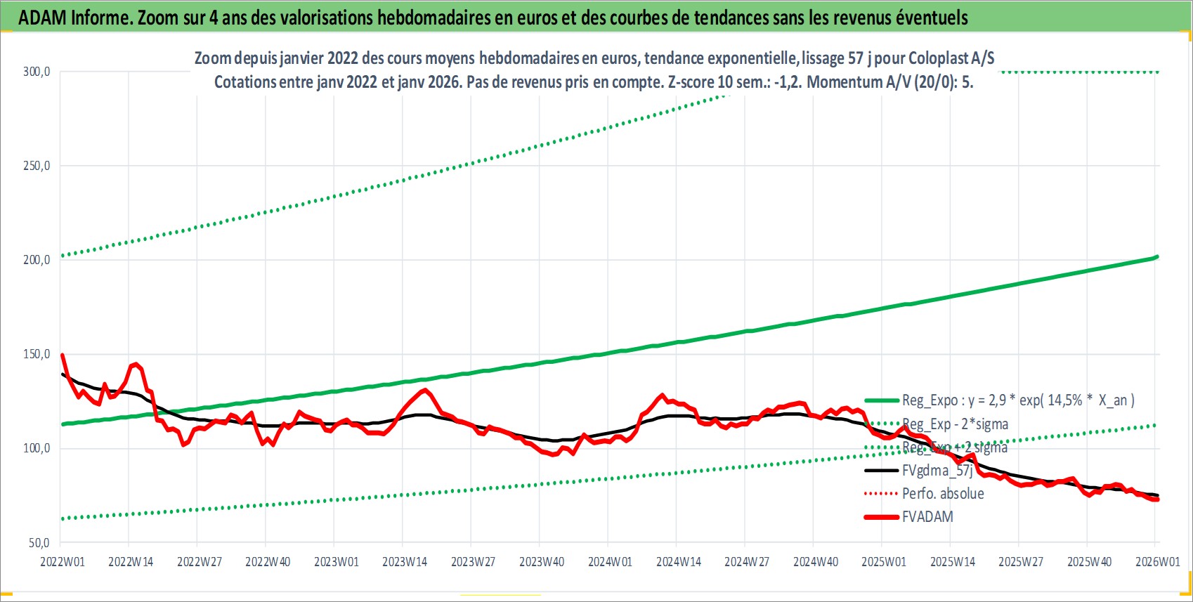 Site dédié aux investisseursPage dédiée sur site financeAnalyse des valorisations hebdomadaires de l'action Coloplast A/S. Cet actif est cote en DKK. Les valorisations sont en contrevaleur EURO et couvrent les semaines 1997W01 a 2026W01. Les revenus de cet actif financier sont pris en compte depuis la semaine 1997W51. La note globale ESG de cet actif est estimee a 13.0 (apres rebasage entre 0 et 20).