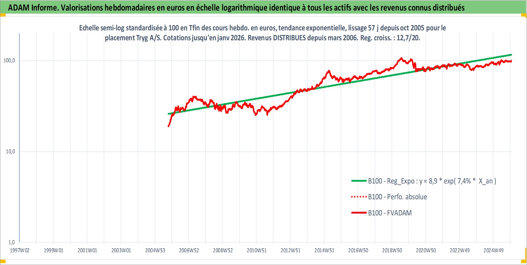 Site dédié aux investisseursPage dédiée sur site financeAnalyse des valorisations hebdomadaires de l'action Tryg A/S. Cet actif est cote en DKK. Les valorisations sont en contrevaleur EURO et couvrent les semaines 2005W41 a 2026W01. Les revenus de cet actif financier sont pris en compte depuis la semaine 2006W13. La note globale ESG de cet actif est estimee a 10.0 (apres rebasage entre 0 et 20).