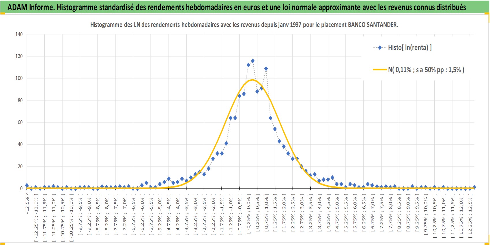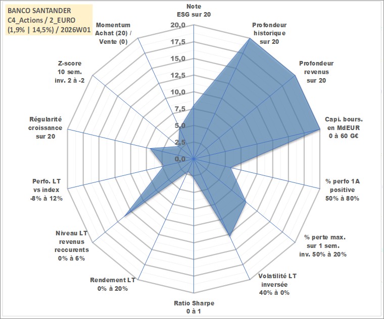 Site dédié aux investisseursPage dédiée sur site financeAnalyse des valorisations hebdomadaires de l'action BANCO SANTANDER. Cet actif est cote en EUR. Les valorisations couvrent les semaines 1997W01 a 2026W01. Les revenus de cet actif financier sont pris en compte depuis la semaine 1997W05. La note globale ESG de cet actif est estimee a 8.0 (apres rebasage entre 0 et 20).
