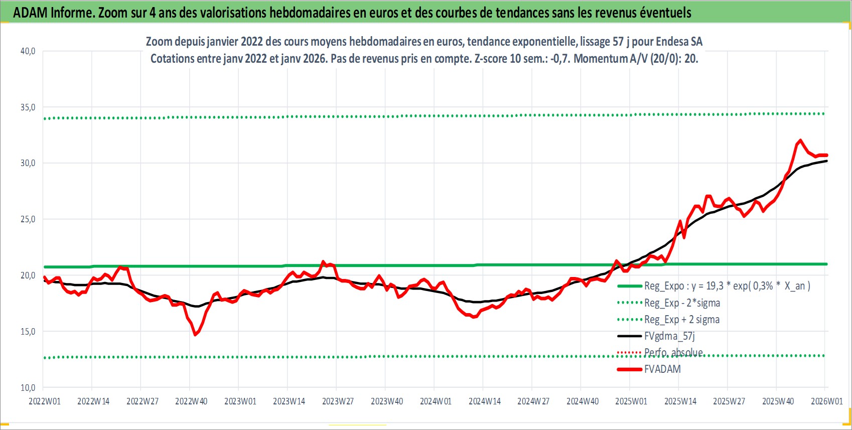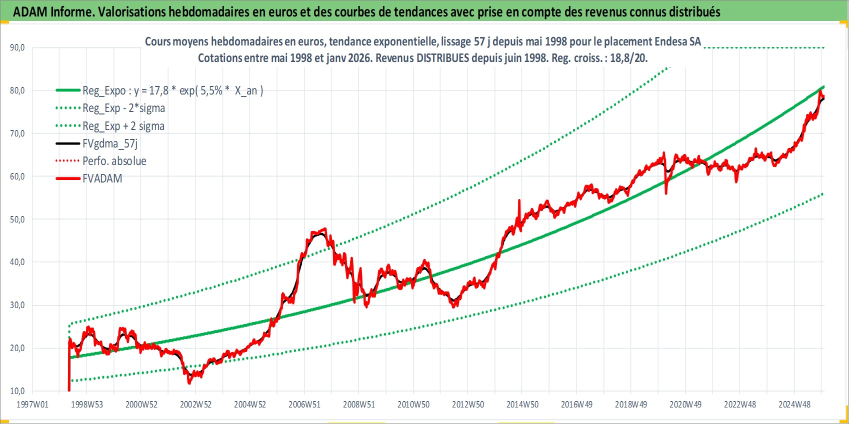 Site dédié aux investisseursPage dédiée sur site financeAnalyse des valorisations hebdomadaires de l'action Endesa SA. Cet actif est cote en EUR. Les valorisations couvrent les semaines 1998W20 a 2026W01. Les revenus de cet actif financier sont pris en compte depuis la semaine 1998W25. La note globale ESG de cet actif est estimee a 12.0 (apres rebasage entre 0 et 20).