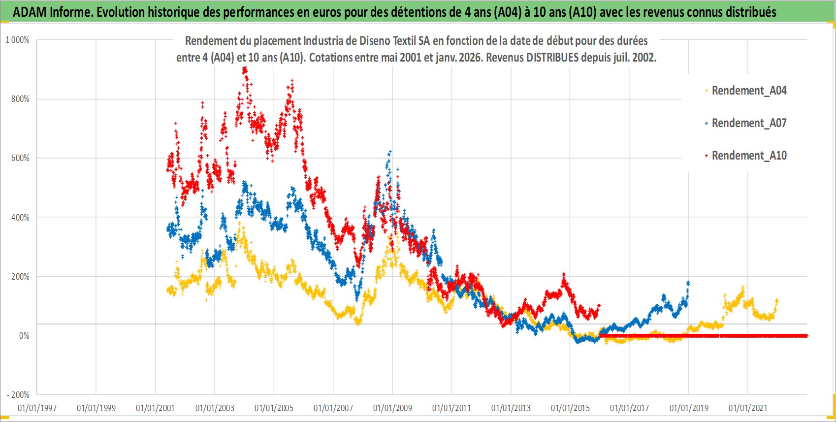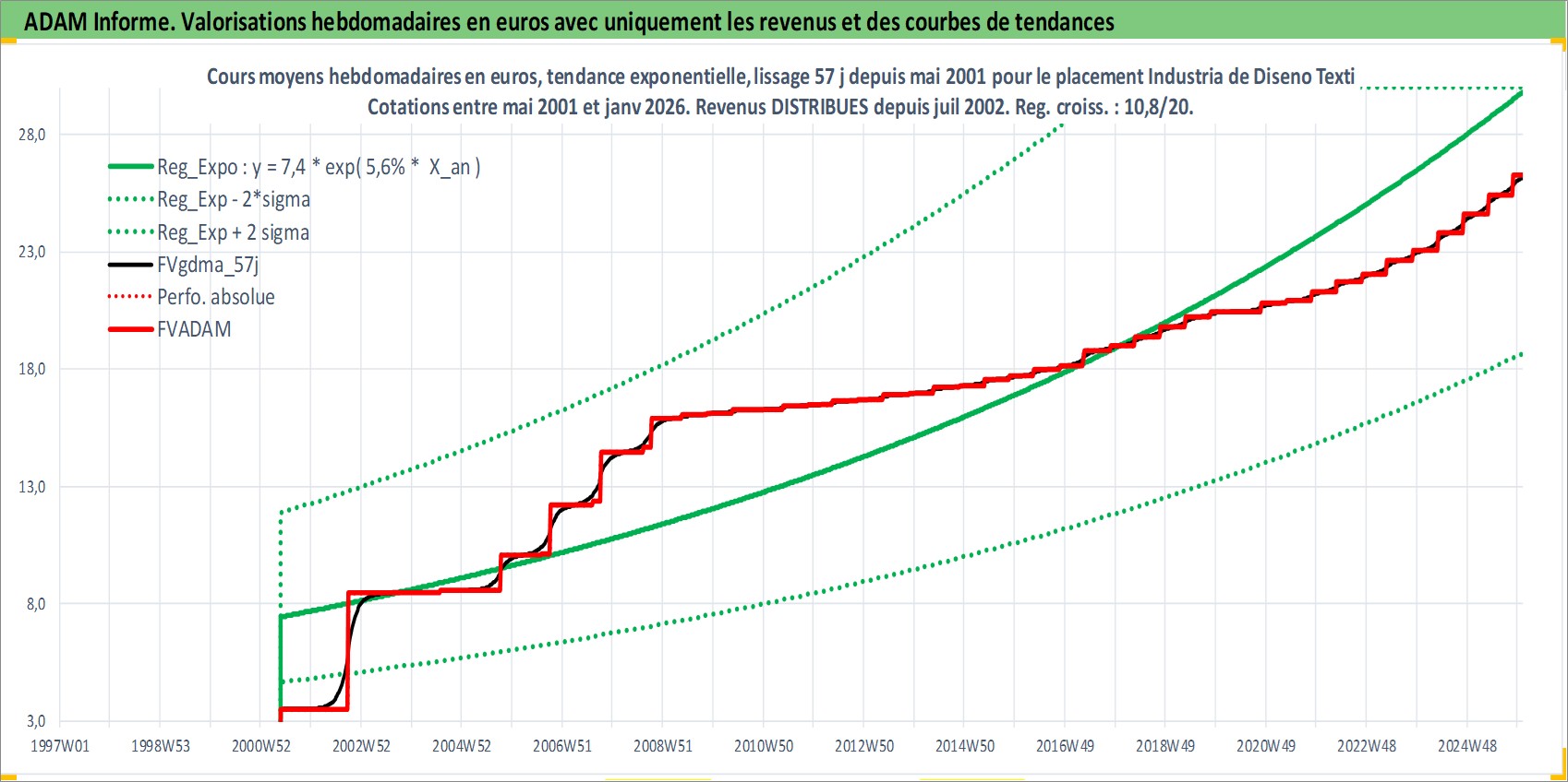 Site dédié aux investisseursPage dédiée sur site financeAnalyse des valorisations hebdomadaires de l'action Industria de Diseno Textil SA. Cet actif est cote en EUR. Les valorisations couvrent les semaines 2001W21 a 2026W01. Les revenus de cet actif financier sont pris en compte depuis la semaine 2002W30. La note globale ESG de cet actif est estimee a 15.0 (apres rebasage entre 0 et 20).