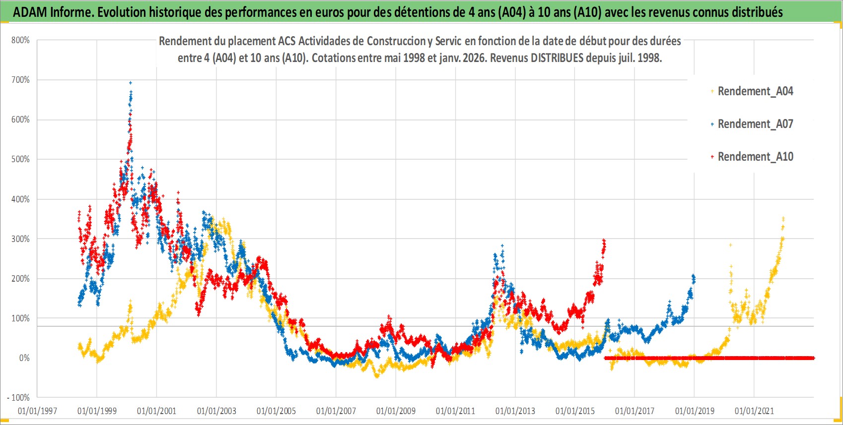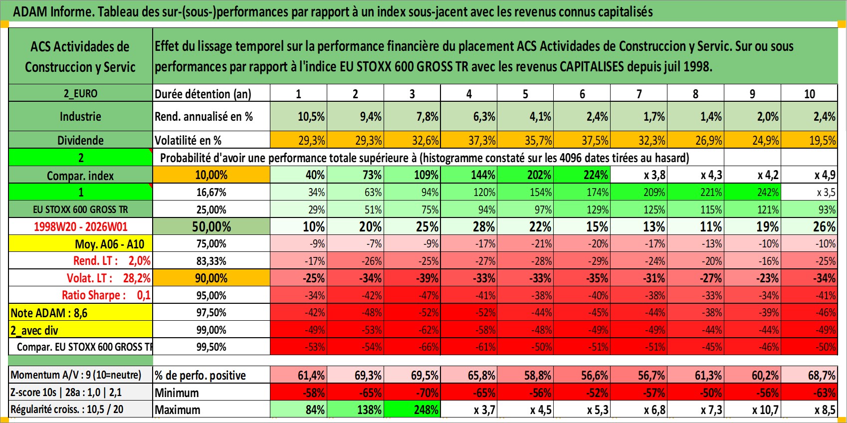 Site dédié aux investisseursPage dédiée sur site financeAnalyse des valorisations hebdomadaires de l'action ACS Actividades de Construccion y Servic. Cet actif est cote en EUR. Les valorisations couvrent les semaines 1998W20 a 2026W01. Les revenus de cet actif financier sont pris en compte depuis la semaine 1998W29. La note globale ESG de cet actif est estimee a 5.0 (apres rebasage entre 0 et 20).