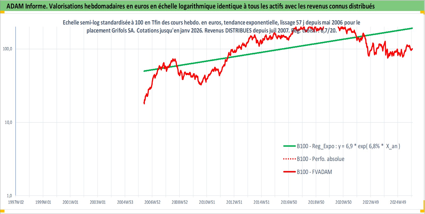 Site dédié aux investisseursPage dédiée sur site financeAnalyse des valorisations hebdomadaires de l'action Grifols SA. Cet actif est cote en EUR. Les valorisations couvrent les semaines 2006W20 a 2026W01. Les revenus de cet actif financier sont pris en compte depuis la semaine 2007W27. La note globale ESG de cet actif est estimee a 11.0 (apres rebasage entre 0 et 20).