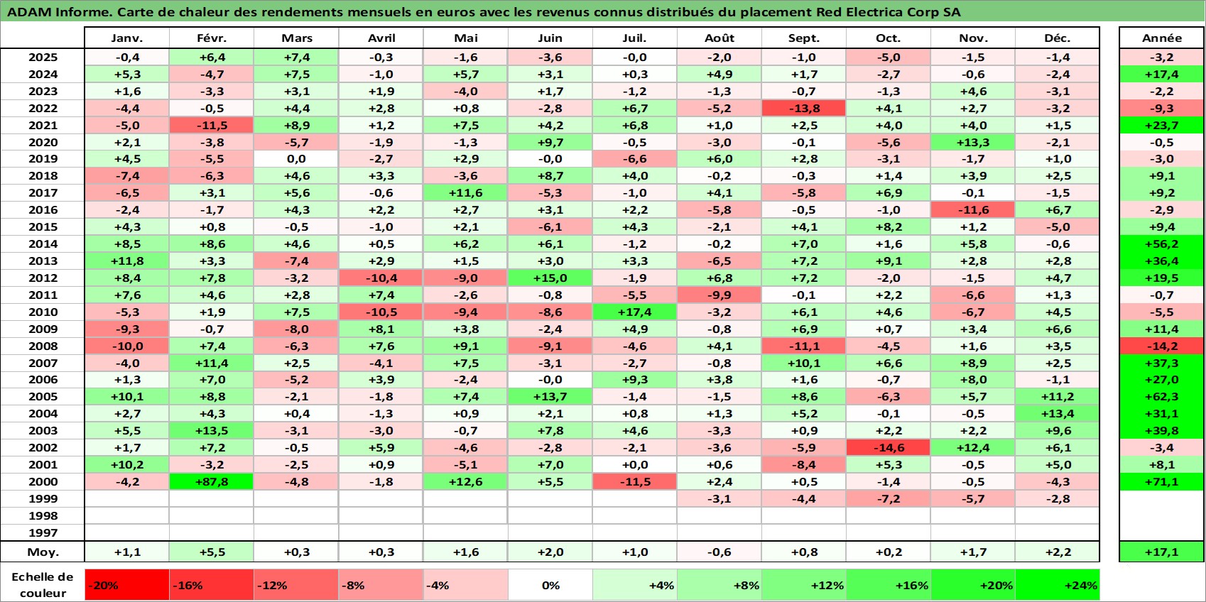 Site dédié aux investisseursPage dédiée sur site financeAnalyse des valorisations hebdomadaires de l'action Red Electrica Corp SA. Cet actif est cote en EUR. Les valorisations couvrent les semaines 1999W27 a 2026W01. Les revenus de cet actif financier sont pris en compte depuis la semaine 1999W47. La note globale ESG de cet actif est estimee a 16.0 (apres rebasage entre 0 et 20).