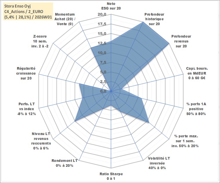 Site dédié aux investisseursPage dédiée sur site financeAnalyse des valorisations hebdomadaires de l'action Stora Enso Oyj. Cet actif est cote en EUR. Les valorisations couvrent les semaines 1997W01 a 2026W01. Les revenus de cet actif financier sont pris en compte depuis la semaine 1997W15. La note globale ESG de cet actif est estimee a 13.0 (apres rebasage entre 0 et 20).