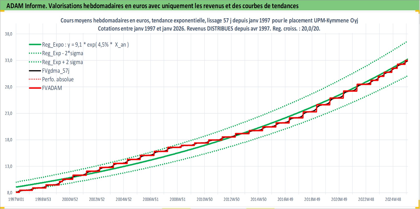 Site dédié aux investisseursPage dédiée sur site financeAnalyse des valorisations hebdomadaires de l'action UPM-Kymmene Oyj. Cet actif est cote en EUR. Les valorisations couvrent les semaines 1997W01 a 2026W01. Les revenus de cet actif financier sont pris en compte depuis la semaine 1997W15. La note globale ESG de cet actif est estimee a 13.0 (apres rebasage entre 0 et 20).