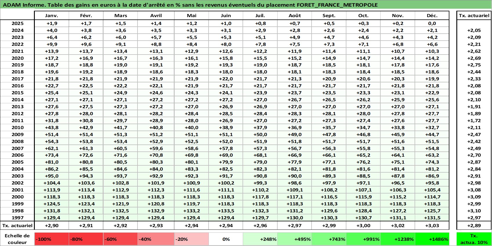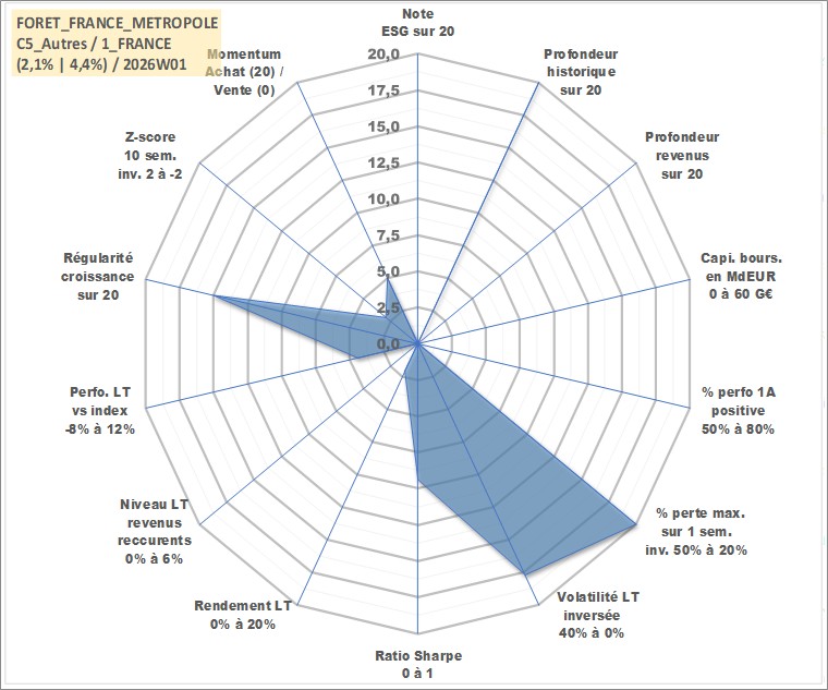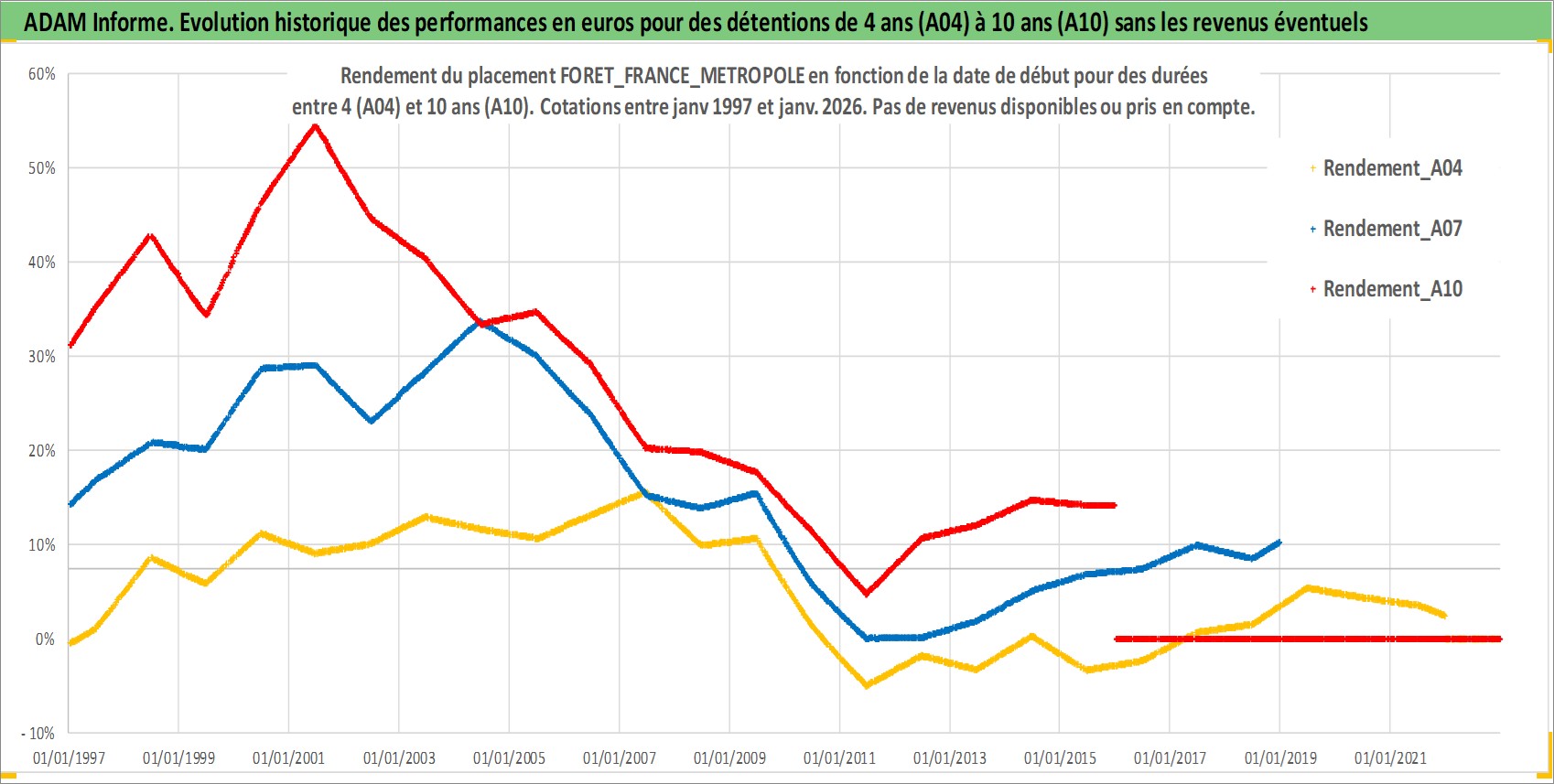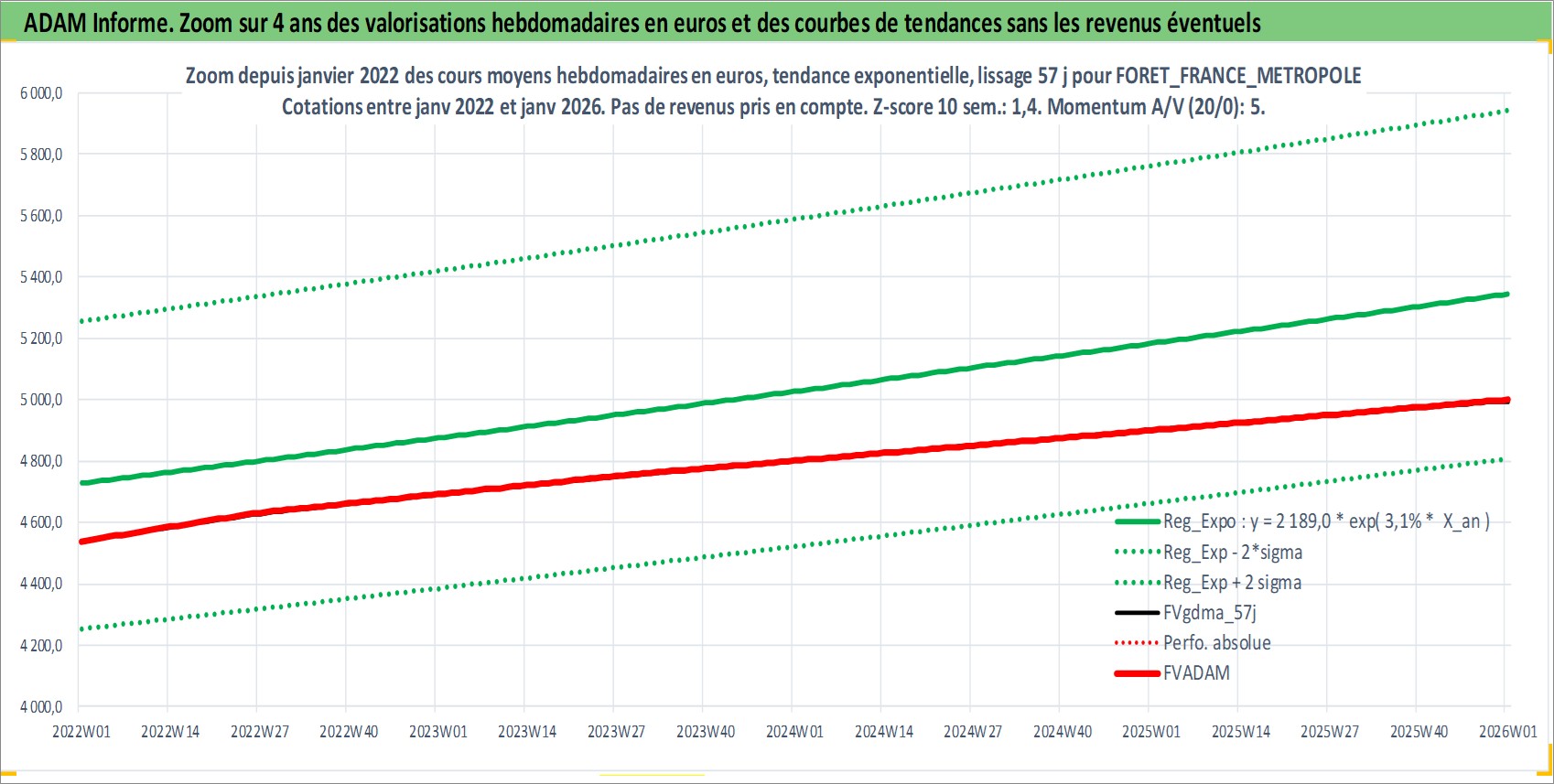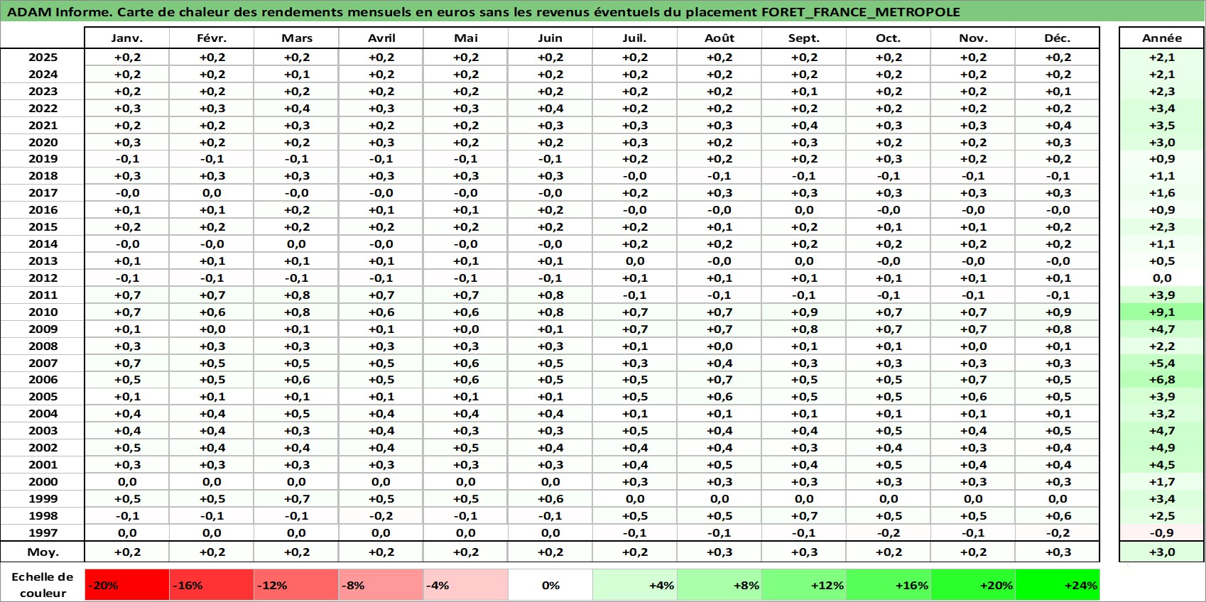 Site dédié aux investisseursPage dédiée sur site financeAnalyse des valorisations hebdomadaires de l'actif FORET_FRANCE_METROPOLE. Cet actif est cote en EUR. Les valorisations couvrent les semaines 1997W01 a 2026W01. Les fermages de ce bien foncier sont pris egaux a 2,5% annuels de la valeur venale du bien.