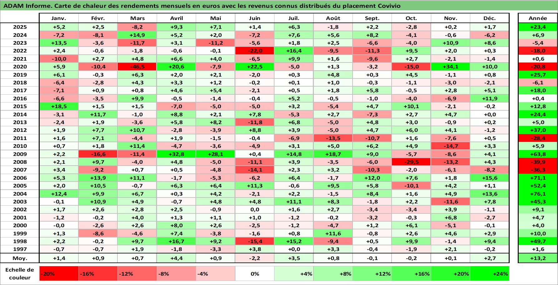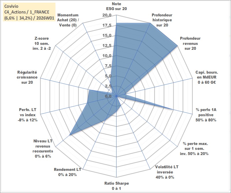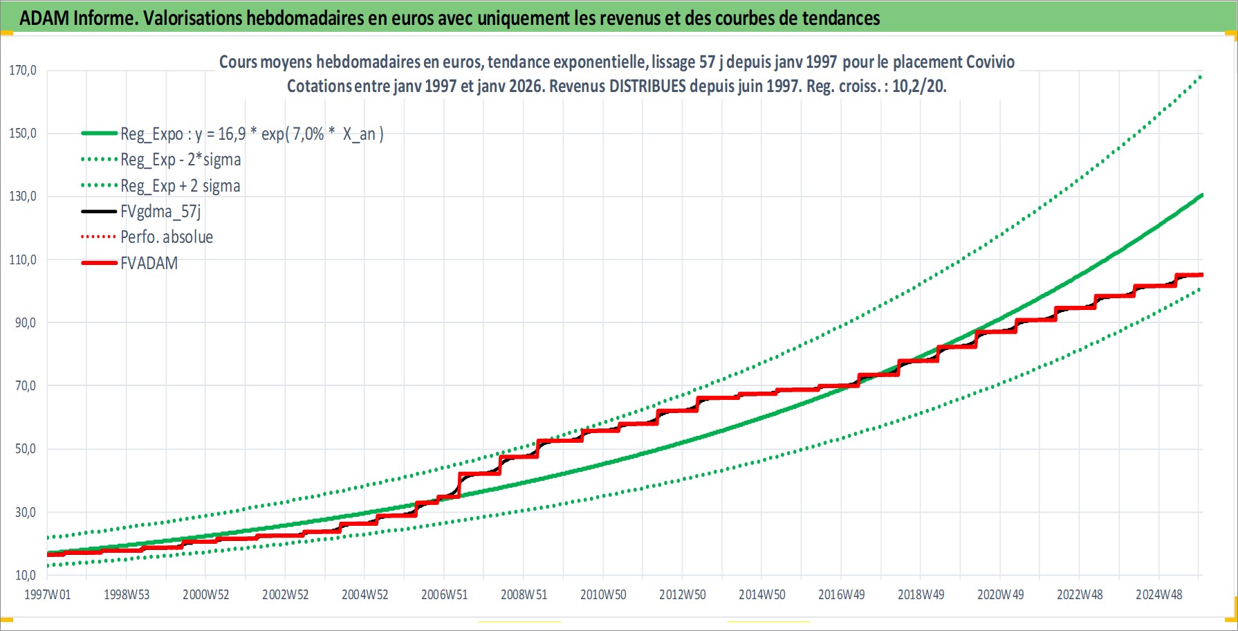 Site dédié aux investisseursPage dédiée sur site financeAnalyse des valorisations hebdomadaires de l'action Covivio. Cet actif est cote en EUR. Les valorisations couvrent les semaines 1997W01 a 2026W01. Les revenus de cet actif financier sont pris en compte depuis la semaine 1997W23. La note globale ESG de cet actif est estimee a 18.0 (apres rebasage entre 0 et 20).