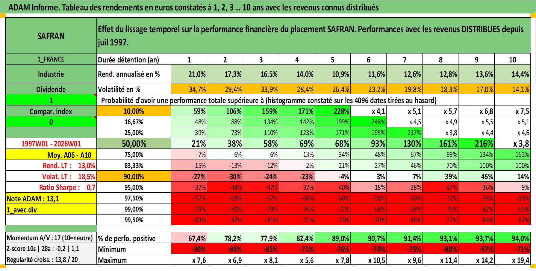 Site dédié aux investisseursPage dédiée sur site financeAnalyse des valorisations hebdomadaires de l'action SAFRAN. Cet actif est cote en EUR. Les valorisations couvrent les semaines 1997W01 a 2026W01. Les revenus de cet actif financier sont pris en compte depuis la semaine 1997W28. La note globale ESG de cet actif est estimee a 9.0 (apres rebasage entre 0 et 20).