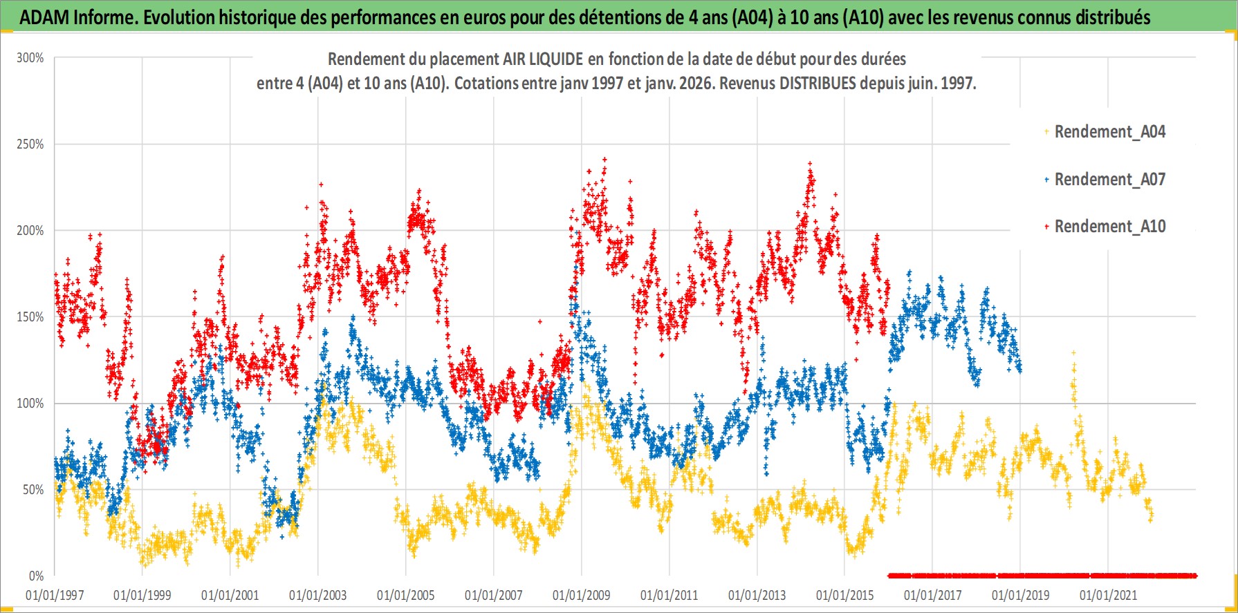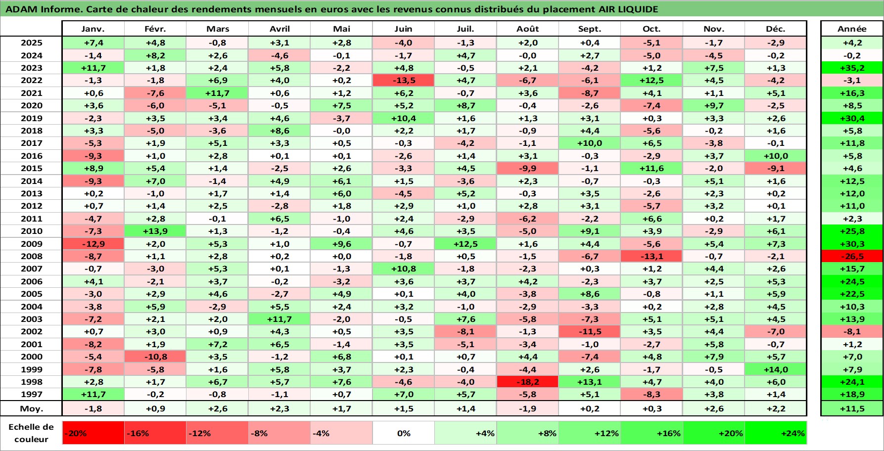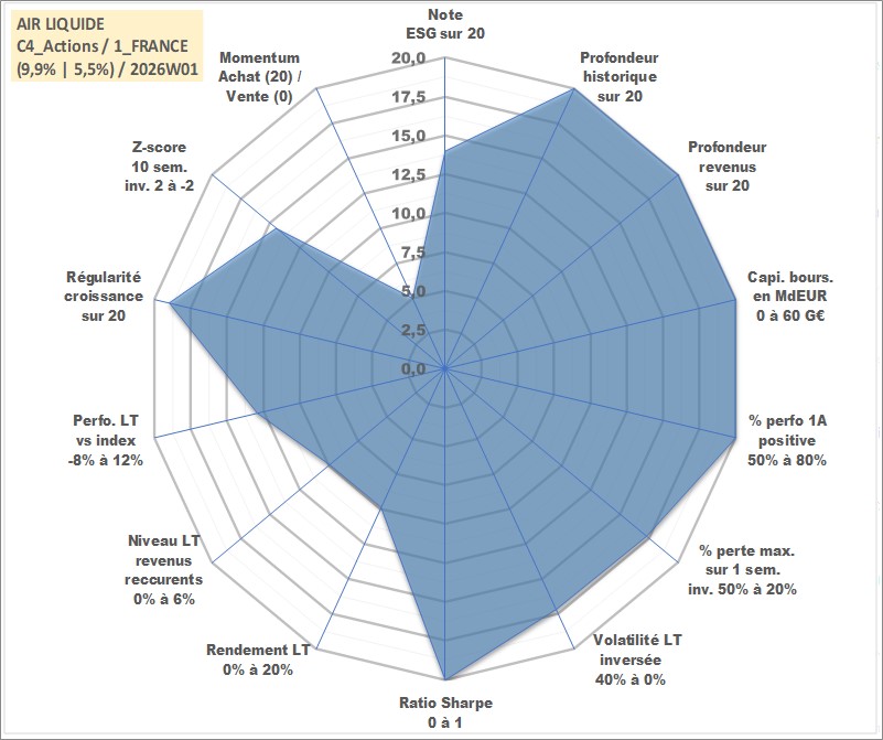 Site dédié aux investisseursPage dédiée sur site financeAnalyse des valorisations hebdomadaires de l'action AIR LIQUIDE. Cet actif est cote en EUR. Les valorisations couvrent les semaines 1997W01 a 2026W01. Les revenus de cet actif financier sont pris en compte depuis la semaine 1997W23. La note globale ESG de cet actif est estimee a 14.0 (apres rebasage entre 0 et 20).