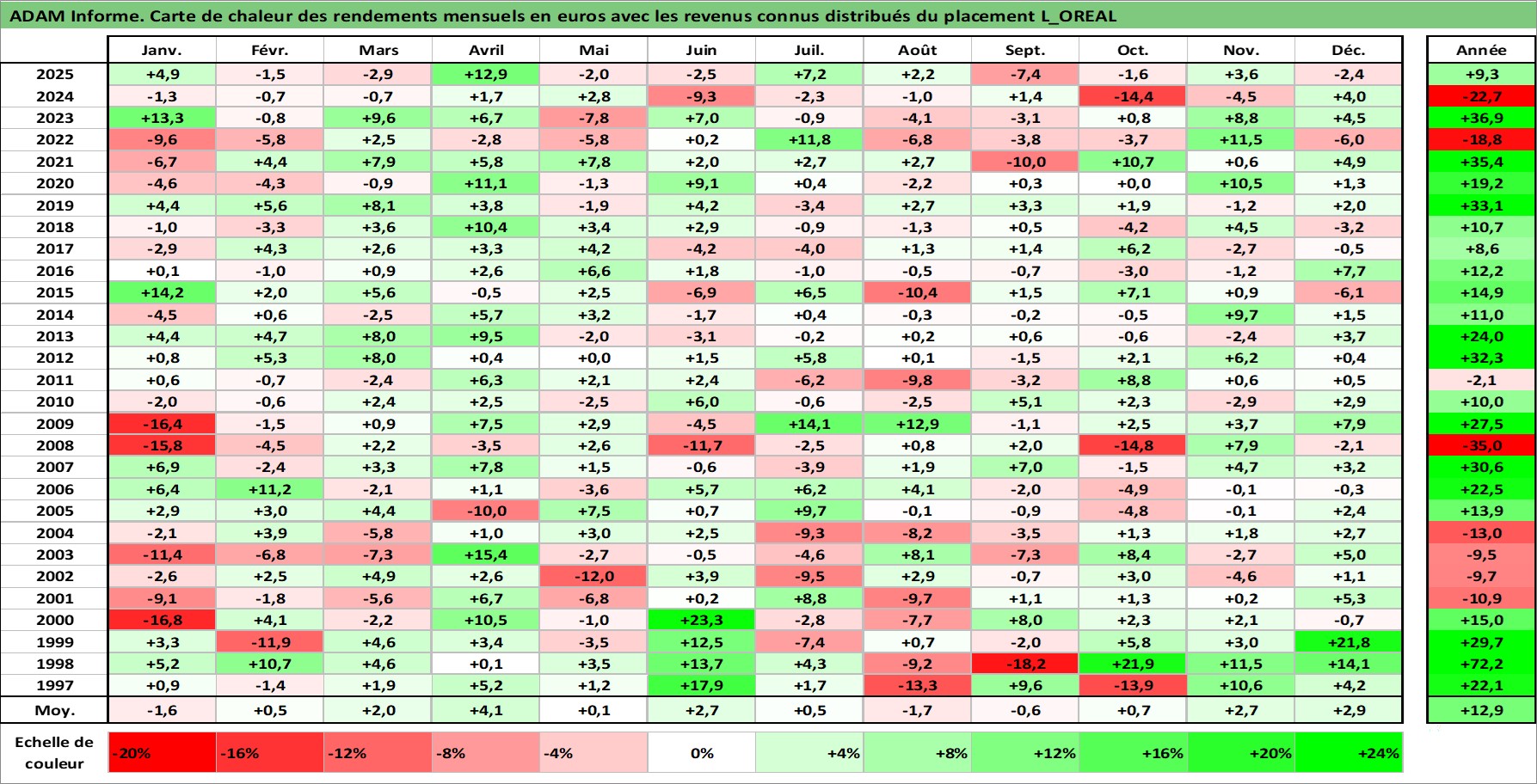 Site dédié aux investisseursPage dédiée sur site financeAnalyse des valorisations hebdomadaires de l'action L_OREAL. Cet actif est cote en EUR. Les valorisations couvrent les semaines 1997W01 a 2026W01. Les revenus de cet actif financier sont pris en compte depuis la semaine 1997W27. La note globale ESG de cet actif est estimee a 12.0 (apres rebasage entre 0 et 20).