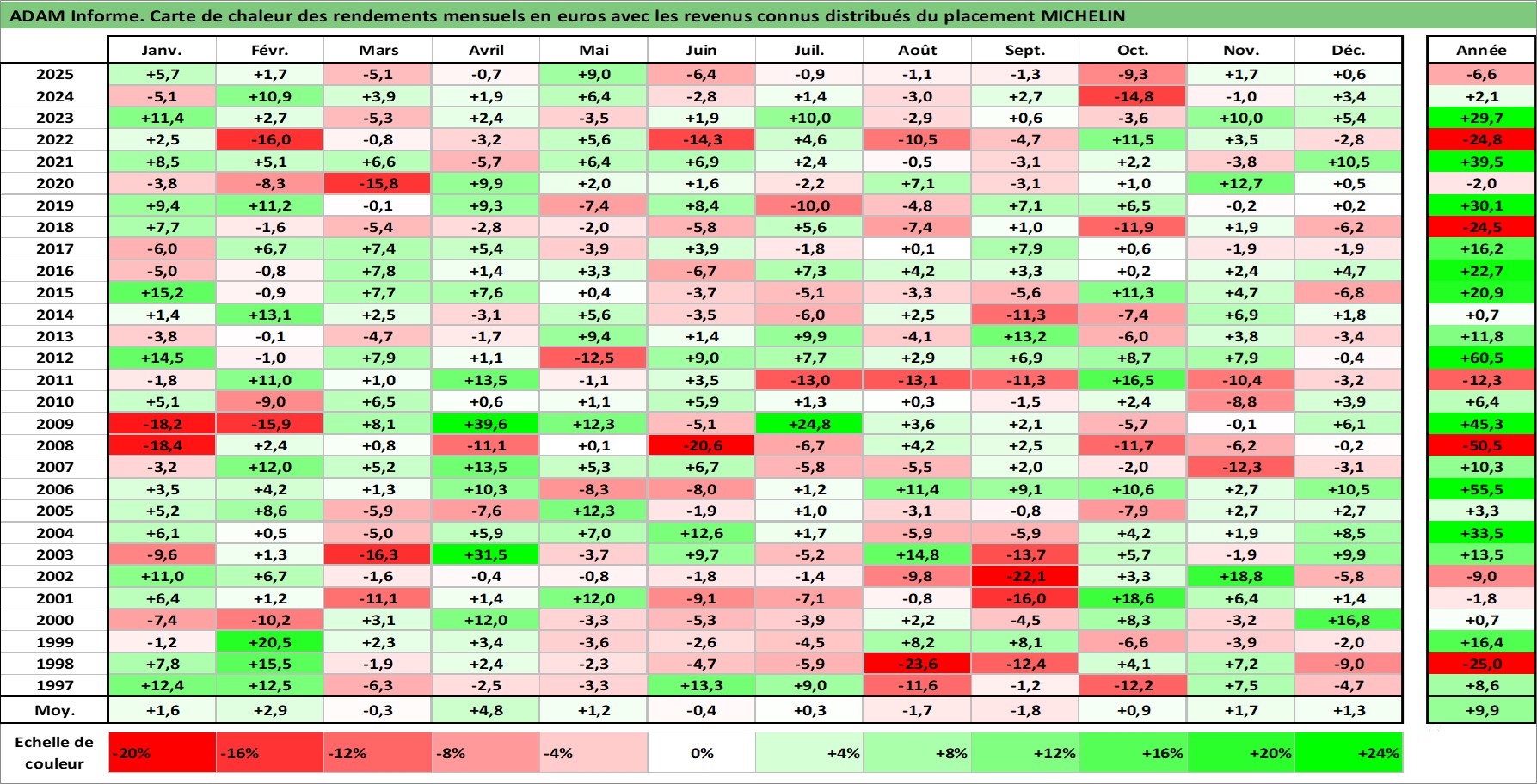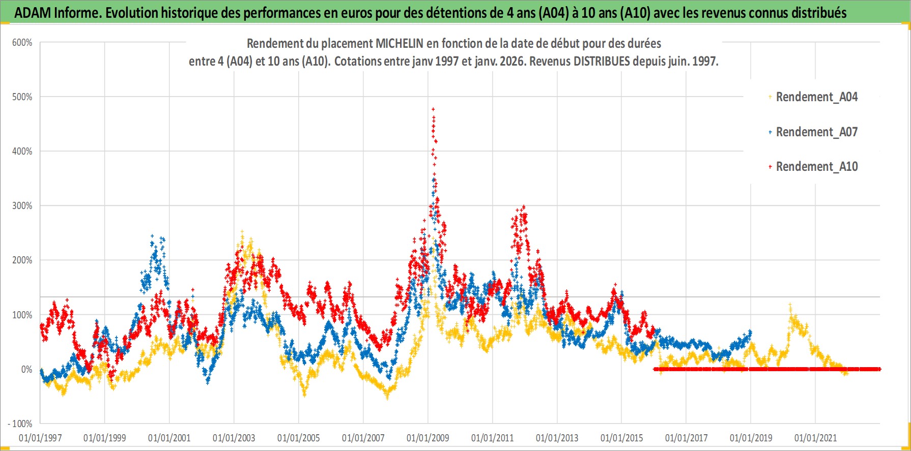 Site dédié aux investisseursPage dédiée sur site financeAnalyse des valorisations hebdomadaires de l'action MICHELIN. Cet actif est cote en EUR. Les valorisations couvrent les semaines 1997W01 a 2026W01. Les revenus de cet actif financier sont pris en compte depuis la semaine 1997W25. La note globale ESG de cet actif est estimee a 15.0 (apres rebasage entre 0 et 20).