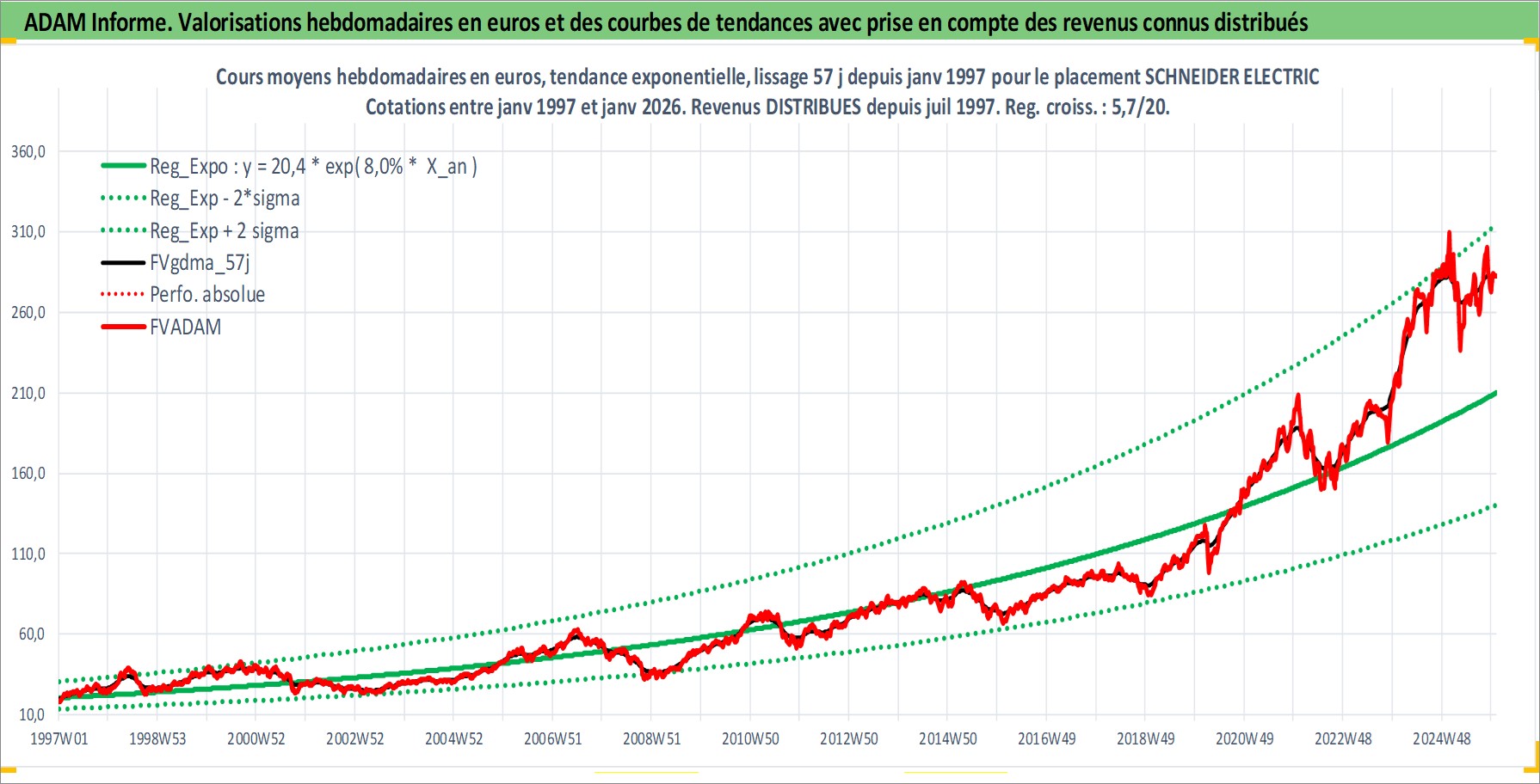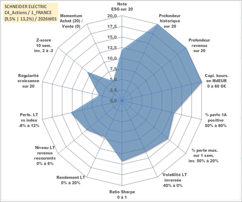 Site dédié aux investisseursPage dédiée sur site financeAnalyse des valorisations hebdomadaires de l'action SCHNEIDER ELECTRIC. Cet actif est cote en EUR. Les valorisations couvrent les semaines 1997W01 a 2026W01. Les revenus de cet actif financier sont pris en compte depuis la semaine 1997W27. La note globale ESG de cet actif est estimee a 12.0 (apres rebasage entre 0 et 20).